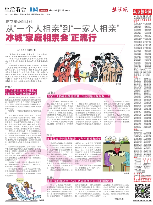 生活报记者于海霞丁燕 “真是孩子大了不由娘,都过30岁了,咋就不着急找对象呢?这个春节假期说啥也得给你介绍一个!” “佩琦,不是当爹的说你,赶紧找个人成家吧!你在南方老单着,我和你妈头发都急白了,放假赶紧回来相亲”…… 儿女的终身大事始终是中国父母的心结。春节快到了,随着外地的子女陆续返乡,很多家庭又开启了“每逢佳节被相亲”。让孩子回家过个团圆年、给未婚子女找到靠谱的伴侣,成了不少父母的新年愿望。可是,经过这几年春节父母的“折腾”,很多青年男女已经不愿意单独赴会,自己看上的父母不满意,父母相中的自己不喜欢,今年相亲时,还要不要带上父母或者是否要参加父母安排的相亲会?近日,生活报记者对此事进行了采访。 故事1 春节要参加五六个相亲会父母牵线不成要断绝关系 夏雪今年33岁,仍是单身。看着女儿岁数越来越大,夏雪的父母更加为她的婚姻大事而焦虑。离春节还有半个多月,父母已经给她安排了五六个聚会。虽然母亲并未说明到底跟谁聚会,但夏雪心知肚明,这是母亲拜托七大姑八大姨安排的相亲会。 “好好的一个假期又要过得稀碎。”夏雪叹息道。 18日,夏雪告诉记者,去年大年初二,父母带着她与父亲的朋友孟伯伯一家吃了顿饭。“小时候,我家在大庆,跟孟伯伯住在一个院里。两家非常要好,谁家做了好吃的,都会给对方送一半。他儿子孟博比我大两岁,嘴甜,我父母也非常喜欢他。”夏雪说,11岁那年,父亲因工作变动,把家搬到了哈尔滨。夏雪和孟博也多年未联系。 多年未见,孟博已长成一个高大俊朗的小伙子,如今他是哈尔滨一家网络公司的中层管理人员。吃饭时,他不停地给夏雪夹菜,对她嘘寒问暖。回到家里,母亲问起夏雪对孟博印象如何,“还不错吧。”听到夏雪的回答,母亲开门见山地说:“我们四个老人的意思是,希望你俩能走到一起。” “父母帮我筛选过的人,应该不会错。”带着对未来美好生活的期许,夏雪和孟博开始约会。但相处一段时间,她发现,孟博有些习惯让她难以接受,“他开车闯红灯、过斑马线不礼让行人还一直鸣笛,市区黄线不能停车,他也不管不顾”。面对夏雪的抱怨,孟博却不屑一顾:“不就是100块钱的事儿吗?” “如果有钱就能无视规则,社会不就乱套了吗?我俩即使结婚了,也不会长久。”两个月后,夏雪毅然决然地提出了分手。 但令夏雪尴尬的是,父亲认为孟博的问题,并不是原则性问题,他希望女儿能继续跟孟博在一起,妈妈更是以断绝母女关系相威胁,弄得夏雪十分郁闷。 故事2 全家齐上阵觅得如意郎君今年要给表妹也找一个 与夏雪相比,沈思应该是幸运的。沈思今年31岁,是哈市一名公务员,老家在齐齐哈尔。去年春节回家,沈思的舅舅安排了一场聚会,沈思一家和舅舅的朋友董叔叔一家都来了。席间,沈思注意到,董叔叔的儿子董磊,文质彬彬、话不太多,一直忙着为大家端茶倒水,沈思也忙着在厨房给舅妈打下手。两天以后,沈思的母亲请吃烤肉,舅舅一家和董叔叔一家都来 了。 聚会结束时,沈思父亲提议,“董磊也在哈尔滨工作,你俩加个微信吧,有事儿能互相照应。”虽然父母和舅舅没明说,但沈思后知后觉地感受到,这两场聚会,其实是家人为她安排的“家庭相亲会”。好在她和董磊学历相当,也都喜欢摄影和旅游。回到哈尔滨后,董磊主动邀请沈思看电影、逛公园。两人约会的次数越来越多,慢慢发展成了恋人。去年圣诞节,两人感觉时机已到,在家人的祝福下,领取了结婚证。在沈思和董磊看来,相亲时“单打独斗”不如“全家齐上阵”,既降低恋爱受伤的风险,又能得到父母的祝福。 沈思告诉记者,她的表妹已经26岁了,舅舅舅妈也开始为她张罗相亲,“今年春节,舅舅和舅妈打算给表妹安排几场相亲会,也是全家总动员。” 故事3 父母苦劝三年没去相亲今年不想回家过年 “你们今年别再给我安排相亲了,要是还那样,我就不回去过年了。”对于在北京工作的王佩琦来说,这几年的春节简直是煎熬,不回家吧,父母就自己一个孩子,回家吧,每次都闹得很不愉快。 佩琦说,他今年32岁了,在父母看来找不着对象都没脸见人,因为亲戚朋友家和自己同龄的都结婚生子了,可在北京像他这样的“大龄”青年很多,大家都忙着创业,不着急找对象成家。 对此,王爸爸很难理解。他感慨道,这三年佩琦过节还没回来,他就已经找老同事、老邻居物色好了对象,就想让儿子回来见上一面,可儿子每次不是说自己感冒了,就是说同学聚会或者单位开视频会议,总以各种理由拒绝相亲,给人家姑娘放鸽子,弄得周围都没人愿意给他介绍对象了,自己和老伴也挺不好意思的。 “佩琦,今年赶紧回来给我相亲。”王爸爸说,这事不能光听孩子的,不达目标绝不放弃。 数据: 冰城“家庭相亲会”兴起 咨询案例比去年同期增两成 19日,记者走访了哈尔滨一家婚姻家庭心理咨询工作室,它也被称为“婚姻医院”。婚姻家庭咨询师、高级心理督导师徐磊表示,近几年,随着“家庭相亲会”的兴起,每逢春节前后,因父母参与儿女相亲导致失败,一家人组团来接受咨询的案例,明显增多。其中,今年要比去年同期增了将近两成。 徐磊坦言,由她经手的案例中,存在的问题大致可分为两类。第一种类型,是因为父母过度插手儿女相亲、甚至是恋爱过程,无视儿女自身的感受,从而导致儿女相亲或恋爱失败。另一种类型,是因为儿女对父