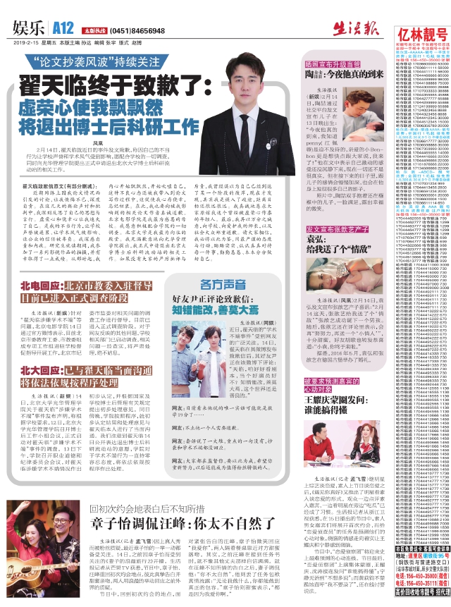 生活报讯(新娱)14日,北京大学光华管理学院关于翟天临“涉嫌学术不端”事件发布声明,称根据学校要求,12日,北京大学光华管理学院召开博士后工作小组会议,正式启动对翟天临“涉嫌学术不端”事件的调查。13日下午,学院召开职业道德和纪律委员会会议,对翟天临涉嫌学术不端情况作出初步认定,并根据国家及学校博士后管理有关规定提出初步处理意见。同日傍晚,学院按照程序,就初步认定结果和处理意见与翟天临本人进行了当面沟通。我们注意到翟天临14日公开表达退出博士后科研流动站的意愿,学院对于学术不端行为一直持零容忍态度,将依法依规按程序作出处理。