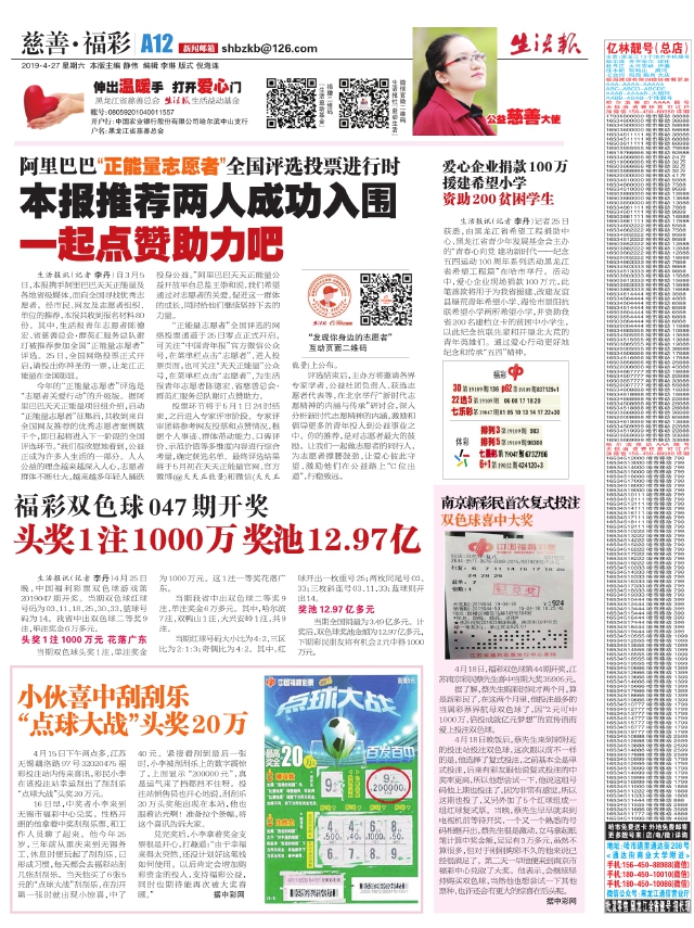 福彩双色球047期开奖头奖1注1000万奖池12.97亿