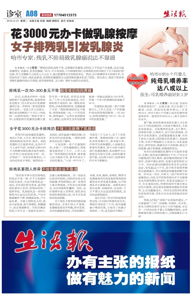 花3000元办卡做乳腺按摩女子排残乳引发乳腺炎