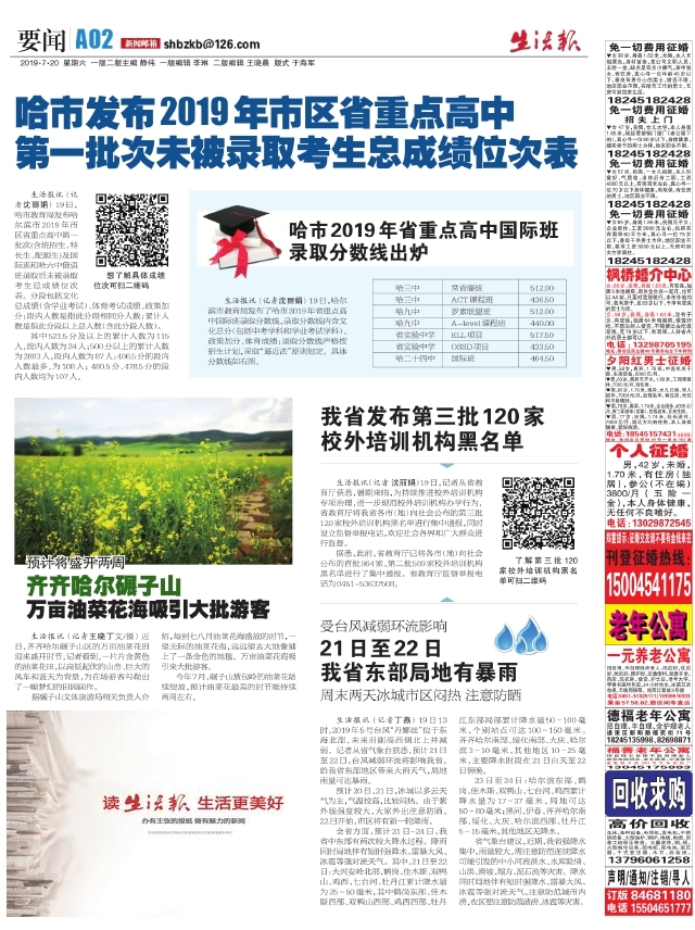 哈市发布2019年市区省重点高中第一批次未被录取考生总成绩位次表