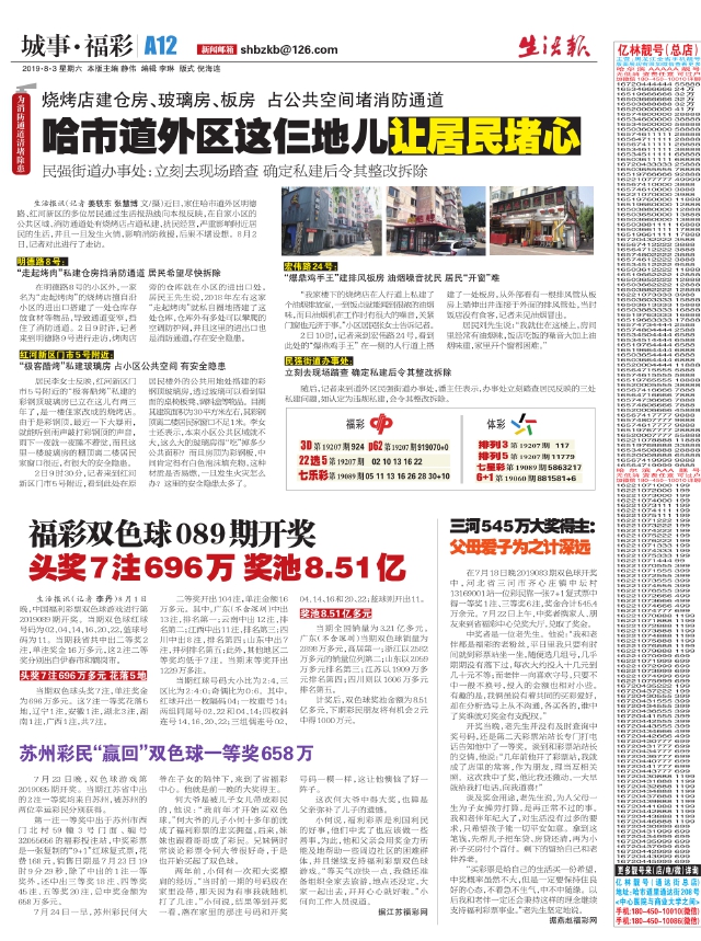 福彩双色球089期开奖头奖7注696万奖池8.51亿