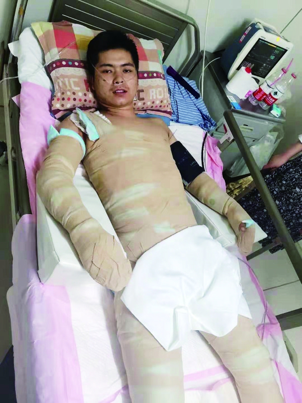 生活报讯(记者赵政府)日前,哈尔滨市建议街一拉面馆的王文华师傅不小心滑倒,一锅40斤滚热的热油洒在身上,造成全身65%烫伤。虽然店开的时间不长,但是朴实的王师傅和常来吃面的顾客关系都非常好。得知王师傅受伤后,顾客纷纷给他捐款,并希望他好了以后开面馆继续做拉面。 在哈尔滨市第五医院,王文华的主治医生告诉记者,患者7月21日晚上送来救治。当时躯干和四肢大面积被烫伤,除了脑袋其他地方均不同程度烫伤。全身烫伤65%,其中浅2度烫伤占40%,深2度占15%,3度占10%。经过几天的救治,伤情有所好转,但是由于家庭条件等原因,7月29日就出院了。 今年22岁的王文华告诉记者,他老家是甘肃广河县的,8个月前带着妻子和两个孩子来到哈尔滨,与别人合伙在建议街开了一家拉面馆。21日晚上客人少了以后,就准备第二天的食材。由于辣椒油用没了,他就准备再炸一锅。他把一锅烧得滚烫的热油端出去,准备凉到100度左右时,再倒进辣椒里。在把油锅端出去的时候,锅的底部碰到了楼梯,脚下一滑,整个人也倒了。再倒的过程中本能地用力端住油锅,不想让油洒,可是还是把油洒在了身上。 “我家只有我一个人挣钱,我烫伤后就失去了经济来源。我父亲的腿在交通事故中受伤了,母亲在家照顾父亲。妻子在家照顾一个3岁和一个1岁的孩子。”王文华告诉记者,事故发生后,花光了家里所有的积蓄,只能转到家乡相对费用低的医院继续治疗。大夫说,后续的治疗费用还得30万元。虽然康复的路程很艰难,但是他也看到了希望。因为,在哈尔滨开面馆时间不长,但常来吃面的顾客和他的关系都非常好,还纷纷给他捐款。 “王师傅非常好,平时话不多,但是待客很真诚,做的面条非常好吃。希望他病好了以后,还能给我们做拉面吃。”一位顾客表示。同时,哈尔滨很多面馆、顾客以及社会上的爱心人士知道他的事后纷纷给他捐款,目前已经收到了约4万元捐款,他的妻子都做了记录,打算赚钱后还回去。图片由家属提供