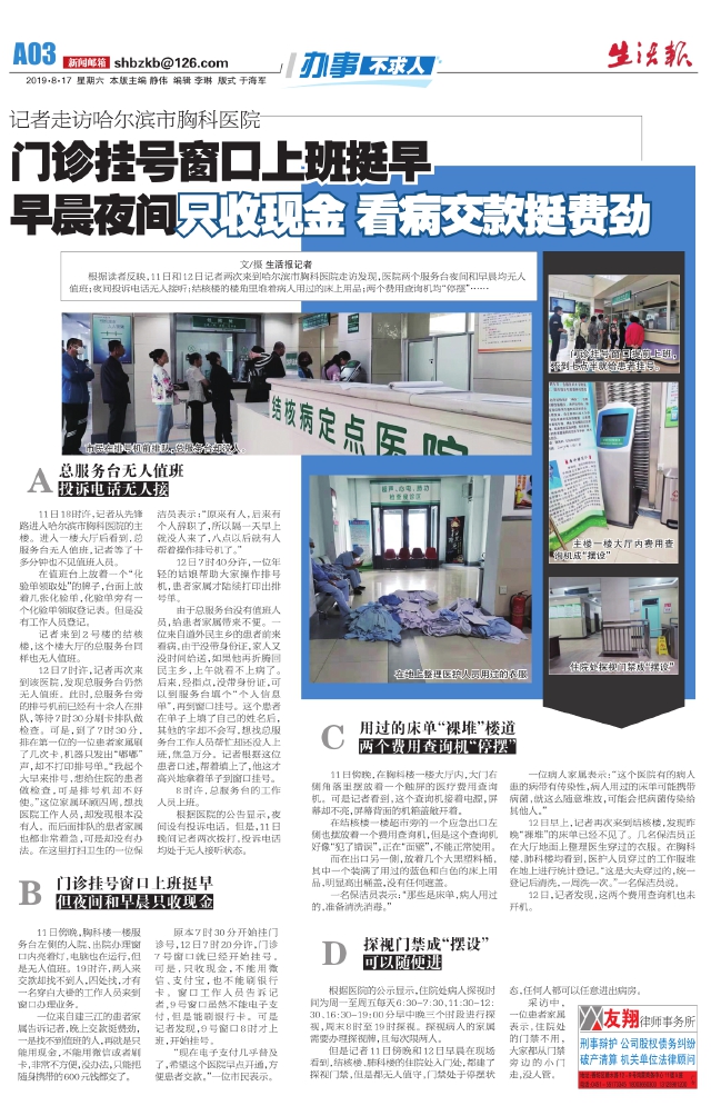 门诊挂号窗口上班挺早 早晨夜间只收现金 看病交款挺费劲