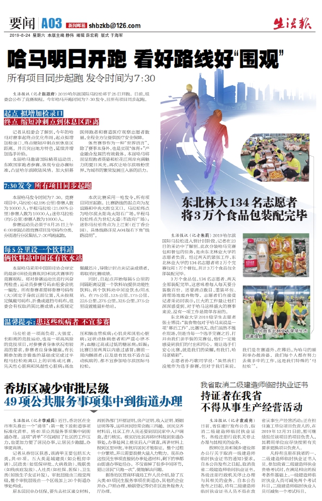 生活报讯(记者朱莉)2019哈尔滨国际马拉松进入倒计时阶段,记者在23日的采访中了解到,此次分装哈马完赛包和餐包的任务,是由东北林业大学的志愿者负责。经过两天的紧张工作,东北林业大学的134名志愿者将2万个完赛包和1万个餐包,共计3万个食品包全部装配完毕。 3万个食品包、134名志愿者、两天全部装配完毕,这意味着每人每天要分装数百份。还要清点数目、重装坏包、清理场地废弃物等。志愿者们在接受记者采访时表示,巨大的工作量让他们深深感受到,对于哈马这样盛大的赛事来说,没有一项工作是简单容易的。 东北林业大学2018级学生志愿者张士博说:“装食物包对于哈马来说是一项‘幕后工作’,比赛当天,我们虽然不能在现场,但是当每一个选手完赛之后,打开由我们亲手装的完赛包,他们一定能感受到我们的付出和用心。能让选手们安心比赛,就是我们的荣耀,有我们,哈马更精彩”。 志愿者孙巧歌同学说:“虽然我们没能作为选手参赛,但对于我们来说,我们是在赛道外、在幕后,为哈马的顺利举办做准备。我们每个人都在努力去做手中的工作,这是我们特殊的‘马拉松’”。