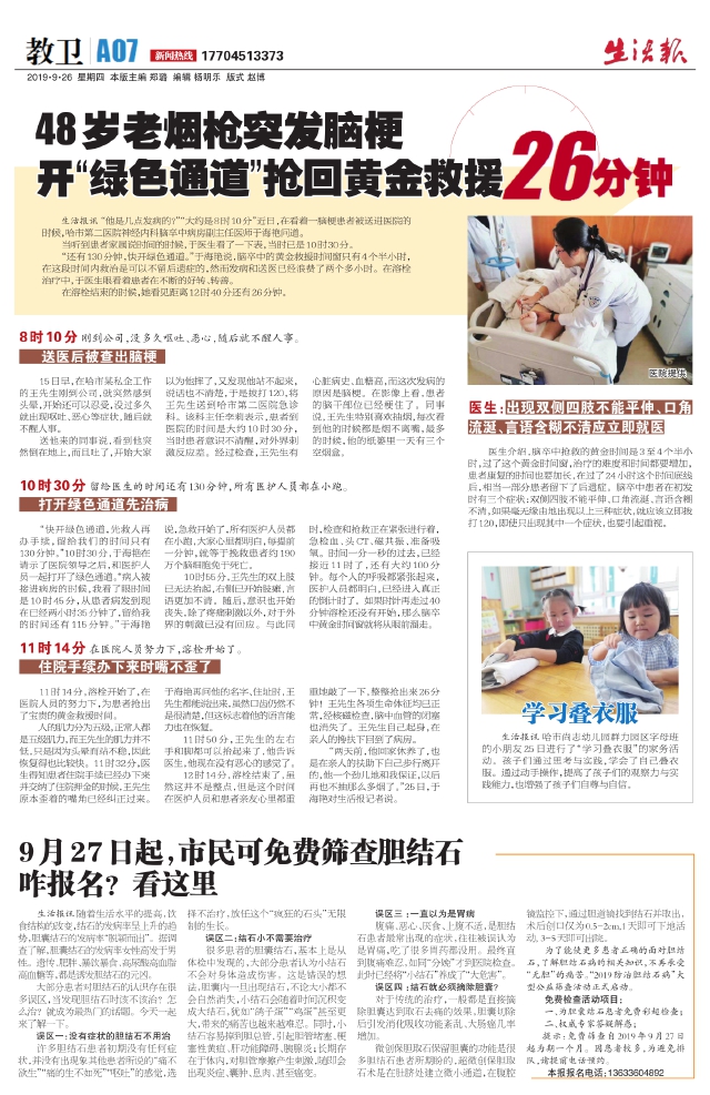 48岁老烟枪突发脑梗开“绿色通道”抢回黄金救援26分钟