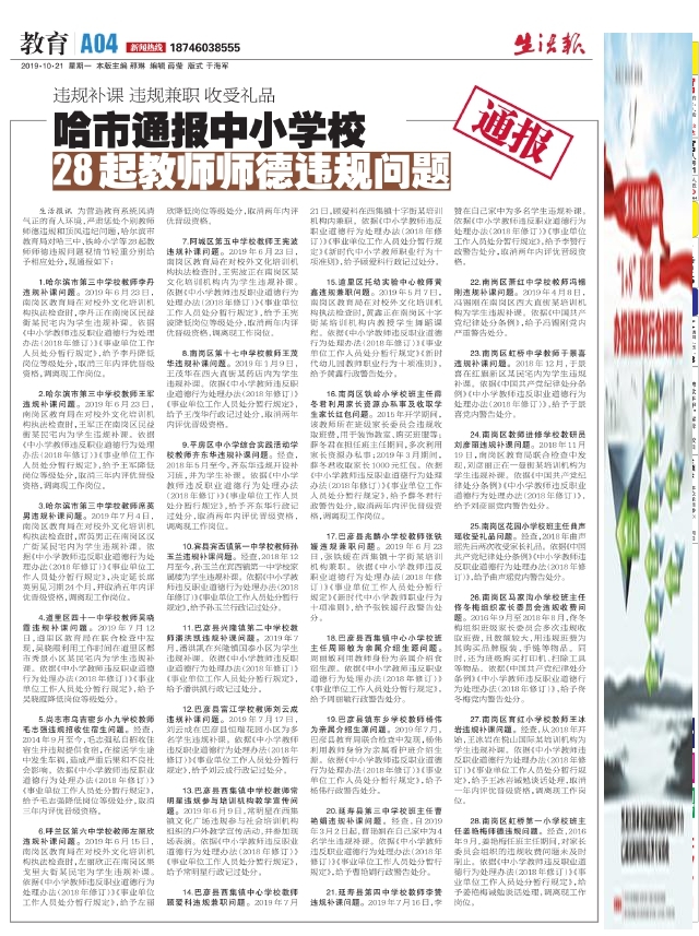 哈市通报中小学校28起教师师德违规问题