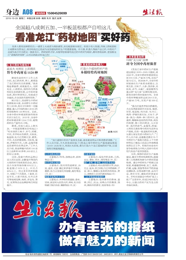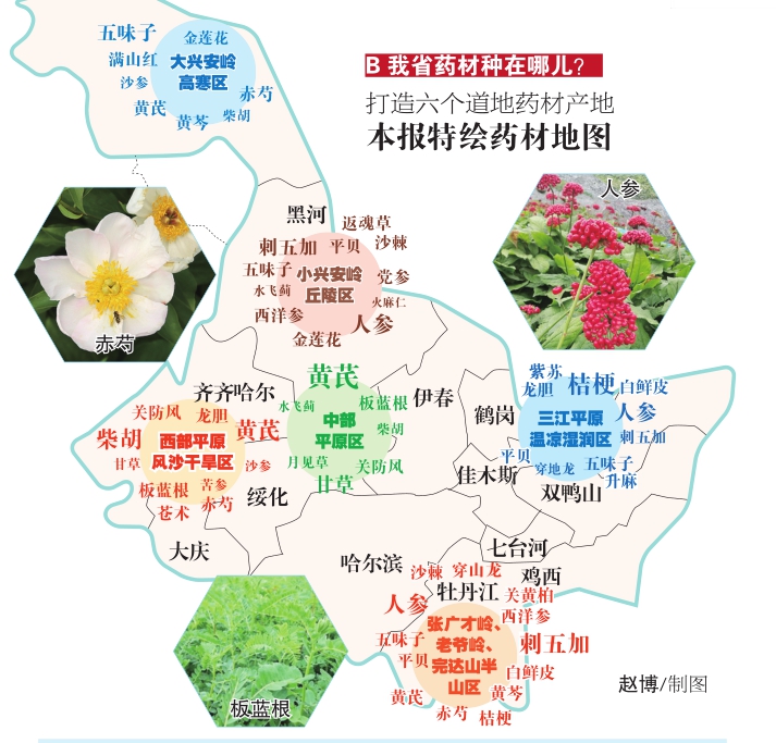 很多人都有这样的经历:一感冒上火或者为预防感冒,来包板蓝根全搞定。但很少有人知道,市场上的板蓝根五成都来自黑龙江,而且咱龙江已经成为全国道地药材生产的重要基地。在石墨、机器人等新产业之后,中药材产业成为龙江打出的又一张新名片。药材好药才好,本报带您看看咱龙江的中药材为啥好,都有些啥品种,更绘制龙江“道地药材地图”,以后买药就买咱龙江的! A龙江药材为啥纯正?温差大光照足土质肥沃 野生中药材有1120种 据省农业农村厅工作人员介绍,龙江的光照、黑土,都塑造了龙江药材的天然禀赋。“我省地处寒温带,昼夜温差大,光照充足,土质肥沃,独特的自然条件和生态资源优势,让中药材更优质,药材种质纯正,有效成分含量高,在全国具有独特优势。” 统计显示,我省野生中药材资源极其丰富,全省野生中药材有1120种,其中378种有一定蕴藏量,载入《中国药典》(2015)的药用植物有130种左右。目前,全省中药材种植面积始终保持在百万亩左右。2018年,全省中药材种植面积124.6万亩,植物药材总产量约25万吨。 据悉,全国八成以上刺五加、一半板蓝根都来自咱龙江!“哈尔滨的五味子、赤芍、桔梗、平贝,齐齐哈尔的黄芪、关防风、板蓝根,牡丹江的刺五加、黄芪、平贝,大庆的板蓝根、关防风、柴胡,伊春的平贝、人参、返魂草都是我省特色优势品种。”工作人员介绍,我省种植中药材100亩以上品种有80多种,500亩以上的有50多种。 目前,我省中药材品种已进入河北安国、安徽亳州等国内大型药材市场和医药企业,刺五加占全国市场份额80%以上,板蓝根占50%以上,平贝占30%以上。经过多年培育和推介,叫响了宁古塔芪、卜奎芪、红星平贝、小蒿子防风、牡丹江赤芍等地域品牌,哈药、珍宝岛、葵花、友博等企业品牌影响力明显提升。 B我省药材种在哪儿? 打造六个道地药材产地本报特绘药材地图 “龙江道地中药材产业风生水起,逐步被业界认可和消费者青睐。”工作人员介绍,不久前我省印发了《黑龙江省中药材生产基地建设规划(2019-2025年)》,布局6大区域,着力打造六个龙江道地药材产地,以道地性引领基地建设。 大兴安岭高寒区 主要地点:呼玛、加格达奇、新林等县(区) 小兴安岭丘陵区 主要地点:黑河市的爱辉区、孙吴、逊克、北安、嫩江和伊春市丰林县、嘉荫、铁力以及绥化市绥棱、海伦等县(市、区) 西部平原风沙干旱区 主要地点:齐齐哈尔的富裕、泰来、甘南、依安和大庆的大同、林甸、杜尔伯特蒙古族自治县、肇源等县(市、区)中部平原区 主要地点:绥化市的北林、兰西、安达、肇东、明水、青冈等县(市、区)张广才岭、老爷岭、完达山半山区 主要地点:哈尔滨市的五常、尚志、方正、延寿、依兰和牡丹江市的海林、宁安、林口、穆棱以及鸡西市的鸡东、密山、虎林和七台河的勃利等县(市) 三江平原温凉湿润区: 主要地点:佳木斯市的桦南、富锦、同江、抚远,双鸭山市的集贤、饶河,鹤岗市的萝北、绥滨等县(市) C未来愿景如何? 叫响“龙九味”品牌跻身全国中药材强省 《黑龙江省中药材生产基地建设规划(2019-2025)》提到,到2020年,全省中药材种植面积达到180万亩,产量36万吨,实现产值72亿元。到2025年,全省中药材标准化生产体系全面建立,以刺五加、五味子、人参、西洋参、关防风、赤芍、火麻仁、板蓝根等为重点的“龙九味”品牌叫响全国,跻身全国中药材强省行列。全省中药材种植面积达到250万亩,产量50万吨,实现产值100亿元。 “重点打造齐齐哈尔的黄芪,大庆及西部草原的关防风、柴胡、甘草、板蓝根,哈尔滨-牡丹江-鸡西-伊春的刺五加、五味子,伊春-铁力-海林-林口的平贝、返魂草,穆棱林业局的西洋参,鸡东的桔梗,林口的白鲜皮,大兴安岭-黑河的赤芍、金莲花,阿城-五常的关黄柏等中药材专品种生产基地,培育一批道地药材品牌,从源头保证优质中药材生产。”工作人员介绍,还要推进落实35个中药材生产基地示范县、5个中药材特色小镇及示范县以外规模基地的认定工作。积极向农业农村部争取将铁力市纳入国家中药材现代农业产业园创建县。 另外,围绕中药材生产基地建设,健全中药材检测机构,鼓励第三方检测机构参与中药材质量检测。建立中药材生产档案记录制度,构建覆盖种植、加工、收购、贮藏、运输、销售等各环节的质量追溯体系,实现来源可查、去向可追、责任可究,确保药材质量安全。在哈尔滨建设中药材“线上+线下”交易平台,形成以哈尔滨为中心,以重点药材产区为支点的市场化体系。