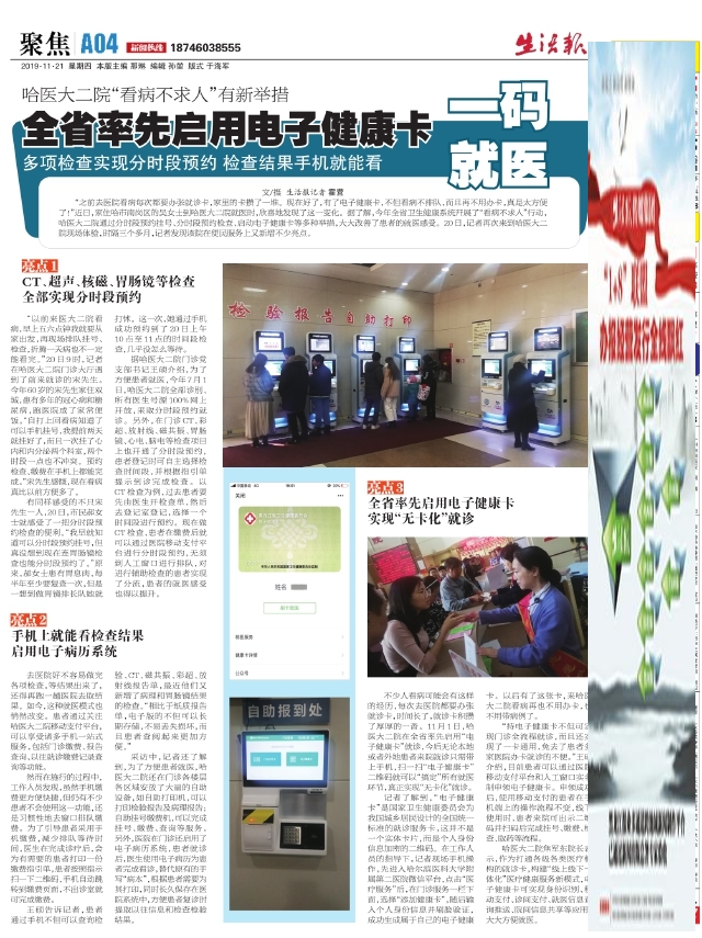 文/摄生活报记者霍营 “之前去医院看病每次都要办张就诊卡,家里的卡攒了一堆。现在好了,有了电子健康卡,不但看病不排队,而且再不用办卡,真是太方便了!”近日,家住哈市南岗区的吴女士到哈医大二院就医时,欣喜地发现了这一变化。据了解,今年全省卫生健康系统开展了“看病不求人”行动,哈医大二院通过分时段预约挂号、分时段预约检查、启动电子健康卡等多种举措,大大改善了患者的就医感受。20日,记者再次来到哈医大二院现场体验,时隔三个多月,记者发现该院在便民服务上又新增不少亮点。 亮点1 CT、超声、核磁、胃肠镜等检查全部实现分时段预约 “以前来医大二院看病,早上五六点钟我就要从家出发,再现场排队挂号、检查,折腾一天病也不一定能看完。”20日9时,记者在哈医大二院门诊大厅遇到了前来就诊的宋先生。今年60岁的宋先生家住双城,患有多年的冠心病和糖尿病,跑医院成了家常便饭。“自打上回看病知道了可以手机挂号,我提前两天就挂好了,而且一次挂了心内和内分泌两个科室,两个时段一点也不冲突。预约检查、缴费在手机上都能完成。”宋先生感慨,现在看病真比以前方便多了。 有同样感受的不只宋先生一人,20日,市民郝女士就感受了一把分时段预约检查的便利。“我早就知道可以分时段预约挂号,但真没想到现在连胃肠镜检查也能分时段预约了。”原来,郝女士患有胃息肉,每半年至少要复查一次,但是一想到做胃镜排长队她就打怵。这一次,她通过手机成功预约到了20日上午10点至11点的时间段检查,几乎没怎么等待。 据哈医大二院门诊党支部书记王硕介绍,为了方便患者就医,今年7月1日,哈医大二院全部诊别、所有医生号源100%网上开放,采取分时段预约就诊。另外,在门诊CT、彩超、放射线、磁共振、胃肠镜、心电、脑电等检查项目上也开通了分时段预约,患者登记时可自主选择检查时间段,并根据指引单提示到诊完成检查。以CT检查为例,过去患者要先由医生开检查单,然后去登记室登记,选择一个时间段进行预约。现在做CT检查,患者在缴费后就可以通过医院移动支付平台进行分时段预约,无须到人工窗口进行排队,对进行辅助检查的患者实现了分流,患者的就医感受也得以提升。 亮点2 手机上就能看检查结果启用电子病历系统 去医院好不容易做完各项检查,等结果出来了,还得再跑一趟医院去取结果。如今,这种就医模式也悄然改变。患者通过关注哈医大二院移动支付平台,可以享受诸多手机一站式服务,包括门诊缴费、报告查询、以往就诊缴费记录查询等功能。 然而在施行的过程中,工作人员发现,虽然手机缴费更方便快捷,但仍有不少患者不会使用这一功能,还是习惯性地去窗口排队缴费。为了引导患者采用手机缴费,减少排队等待时间,医生在完成诊疗后,会为有需要的患者打印一份缴费指引单,患者按照指示扫一下二维码,手机自动跳转到缴费页面,不出诊室就可完成缴费。 王硕告诉记者,患者通过手机不但可以查询检验、CT、磁共振、彩超、放射线报告单,最近他们又新增了病理和胃肠镜结果的检查。“相比于纸质报告单,电子版的不但可以长期存储,不易丢失损坏,而且患者查阅起来更加方便。” 采访中,记者还了解到,为了方便患者就医,哈医大二院还在门诊各楼层各区域安放了大量的自助设备,如自助打印机,可以打印检验报告及病理报告;自助挂号缴费机,可以完成挂号、缴费、查询等服务。另外,医院在门诊还启用了电子病历系统,患者就诊后,医生使用电子病历为患者完成看诊,替代原有的手写“病本”,根据患者需要为其打印,同时长久保存在医院系统中,方便患者复诊时提取以往信息和检查检验结果。 亮点3 全省率先启用电子健康卡实现“无卡化”就诊 不少人看病可能会有这样的经历,每次去医院都要办张就诊卡,时间长了,就诊卡积攒了厚厚的一沓。11月1日,哈医大二院在全省率先启用“电子健康卡”就诊,今后无论本地或者外地患者来院就诊只需带上手机,扫一扫“电子健康卡”二维码就可以“搞定”所有就医环节,真正实现“无卡化”就诊。 记者了解到,“电子健康卡”是国家卫生健康委员会为我国城乡居民设计的全国统一标准的就诊服务卡,这并不是一个实体卡片,而是个人身份信息加密的二维码。在工作人员的指导下,记者现场手机操作,先进入哈尔滨医科大学附属第二医院微信平台,点击“医疗服务”后,在门诊服务一栏下面,选择“添加健康卡”,随后输入个人身份信息并刷脸验证,成功生成属于自己的电子健康卡。以后有了这张卡,来哈医大二院看病再也不用办卡,也不用带病例了。 “持电子健康卡不但可实现门诊全流程就诊,而且还实现了一卡通用,免去了患者多家医院办卡就诊的不便。”王硕介绍,目前患者可以通过医院移动支付平台和人工窗口实名制申领电子健康卡。申领成功后,使用移动支付的患者在手机端上的操作流程不变,线下使用时,患者来院可出示二维码并扫码后完成挂号、缴费、检查、取药等流程。 哈医大二院焦军东院长表示,作为打通各级各类医疗机构的就诊卡,构建“线上线下一体化”医疗健康服务新模式,电子健康卡可实现身份识别、移动支付、诊间支付、就医信息查询推送、院间信息共享等应用,大大方便就医。