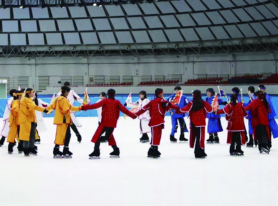生活报讯 近日,记者在黑龙江大学校内看到,有不少穿着民族服饰的黑大学生,脚踩冰刀、手举旗帜,列队在冰场上练习滑行。据现场指导教师、黑大体育教研部的唐云松教授介绍,学生们正在上“冰嬉”选修课,“冰嬉”是过去满族人冬天的一种体育运动,黑大是国内少有的开设“满语”专业的大学,希望通过这种方式传承满语和满族文化。据另一位讲授满族传统体育课的国梁老师介绍:“今年冬天有30名本科生选修了这门课,每周他们在冰上学习两个学时一个半小时。”