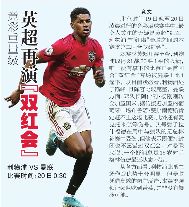 利物浦VS曼联 比赛时间:20日0:30 竞文 北京时间19日晚至20日凌晨进行的竞彩足球赛事中,最令人关注的无疑是英超“红军”利物浦与“红魔”曼联之间的本赛季第二回合“双红会”。 本赛季英超开赛至今,利物浦取得21战20胜1平的战绩,唯一没有拿下的比赛正是首回合“双红会”客场被曼联1比1逼平。从目前状态看,利物浦处于巅峰,且阵容比较完整。曼联方面,老队长阿什利·杨刚刚转会加盟国米,据传接近加盟的葡萄牙中场布鲁诺·费尔南德斯肯定赶不上这场比赛,此外还有麦克托米奈等伤号。头号射手拉什福德在周中与狼队的足总杯补赛中受伤,但他表示即便打封闭也不愿错过双红会。对曼联来说,一个好消息是18岁射手格林伍德最近状态不错。 从各方面看,利物浦此番主场作战优势十分明显。但曼联凭借高效的防守反击,本赛季频频让强队吃到苦头,并非没有爆冷可能。