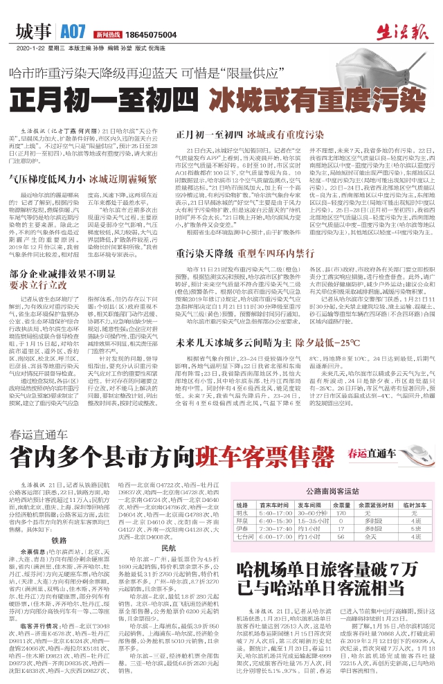 生活报讯(记者丁燕何兴丽)21日哈尔滨“天公作美”,早晨风力加大、扩散条件好转,市区内久违的蓝天白云再度“上线”。不过好空气只是“限量供应”,预计25日至28日(正月初一至初四),哈尔滨等地或有重度污染,请大家出门注意防护。 气压梯度低风力小冰城近期霾频繁 最近哈尔滨的霾是哪来的?记者了解到,根据污染物源解析发现,燃煤供暖、汽车尾气等仍是哈尔滨近期污染物的主要来源。除此之外,不利的气象条件也是近期霾产生的重要原因。2019年12月份以来,我省气象条件同比较差,相对湿度高,风速下降,这两项在近五年来都处于最差水平。 “哈尔滨市近期多次出现重污染天气过程,主要原因是受弱冷空气影响,气压梯度较低,风力较弱,大气边界层降低,扩散条件较差,污染物长时间累积所致。”我省生态环境专家表示。 部分企业减排效果不明显要求立行立改 记者从省生态环境厅了解到,为有效应对重污染天气,省生态环境保护监察办公室、省生态环境保护综合行政执法局、哈尔滨生态环境监察局组成联合督导检查组,于1月15日起,对哈尔滨市道里区、道外区、香坊区、南岗区、松北区、呼兰区、巴彦县、宾县等地重污染天气应对情况开展督导检查。 通过检查发现,各县(区)政府虽然按照《哈尔滨市重污染天气应急预案》要求制定了预案,建立了重污染天气应急指挥体系,但仍存在以下问题:个别县(区)政府重视不够,相关职能部门动作迟缓、协调不力,应急响应缺少统一规划,随意性强;企业应对措施缺少可操作性,重污染天气减排效果不明显,相关责任部门监管不严。 针对发现的问题,督导组指出,要充分认识重污染天气应对工作的重要性和紧迫性。针对存在的问题要立行立改,对不能马上解决的问题,要制定整改计划,列出整改时间表,按时完成整改。 正月初一至初四冰城或有重度污染 21日白天,冰城好空气短暂回归。记者在“空气质量发布APP”上看到,当天凌晨开始,哈尔滨市区空气质量不断好转。6时至10时,市区实时AQI指数都在100以下,空气质量等级为良。10时数据显示,哈尔滨市12个空气质量监测点,空气质量都达标。“21日哈市南风加大,加上有一个高空冷槽过境,有利污染物扩散。”哈尔滨气象台专家表示,21日早晨冰城的“好空气”主要是由于风力大有利于污染物扩散,但是这波白云蓝天的“待机时间”并不会太长。“21日晚上开始,哈尔滨风力变小,扩散条件又会变差。” 根据省生态环境监测中心预计,由于扩散条件并不理想,未来7天,我省多地仍有污染。22日,我省西北部地区空气质量以良-轻度污染为主,西南部地区以中度-重度污染为主(哈尔滨以重度污染为主,局地短时可能出现严重污染),东部地区以轻度-中度污染为主(局地可能出现短时中度以上污染)。23日-24日,我省西北部地区空气质量以优-良为主,西南部地区以中度污染为主,东部地区以良-轻度污染为主(局地可能出现短时中度以上污染)。25日-28日(正月初一至初四),我省西北部地区空气质量以良-轻度污染为主,西南部地区空气质量以中度-重度污染为主(哈尔滨等地以重度污染为主),其他地区以轻度-中度污染为主。 重污染天降级重型车四环内禁行 哈市11日21时发布重污染天气二级(橙色)预警。根据监测实况和预报,哈尔滨市区扩散条件转好,预计未来空气质量不符合重污染天气二级(橙色)预警条件。根据《哈尔滨市重污染天气应急预案(2019年修订)》规定,哈尔滨市重污染天气应急指挥部决定自1月21日11时30分降级至重污染天气三级(黄色)预警。预警解除时间另行通知。 哈尔滨市重污染天气应急指挥部办公室要求,各区、县(市)政府、市政府各有关部门要立即按职责分工落实响应措施,进行检查督查。此外,请广大市民做好健康防护,减少户外运动;建议公众和有关单位积极采取减排措施,减缓污染物积累。 记者从哈尔滨市交警部门获悉,1月21日11时30分起,全天禁止建筑垃圾、渣土运输、混凝土、砂石运输等重型车辆在四环路(不含四环路)合围区域内道路行驶。 未来几天冰城多云间晴为主除夕最低-25℃ 根据省气象台预计,23-24日受较强冷空气影响,各地气温明显下降;22日我省北部和东南部有阵雪;23日,我省除西南部地区外,其他大部地区有小雪,其中哈尔滨东部、牡丹江西部局地有中雪。同时伴有4至6级西北风,能见度较低。未来7天,我省气温先降后升。23-24日,全省有4至6级偏西或西北风,气温下降6至8℃,局地降8至10℃。24日达到最低,后期气温逐渐回升。 未来几天,哈尔滨市以晴或多云天气为主,气温有所波动,24日是除夕夜,市区最低温只有-25℃。26日开始,市区气温将有显著回升,预计27日市区最高温或达到-4℃。气温回升,给霾的发展留出空间。
