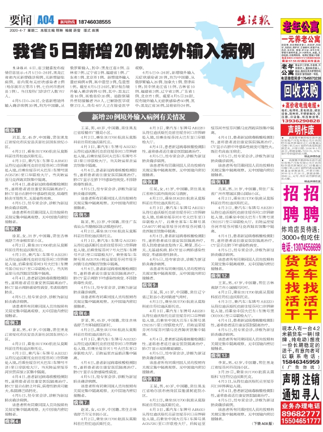 我省5日新增20例境外输入病例