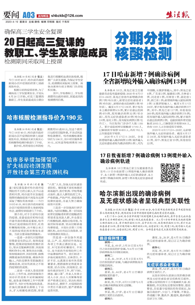 20日起高三复课的教职工、学生及家庭成员分期分批核酸检测