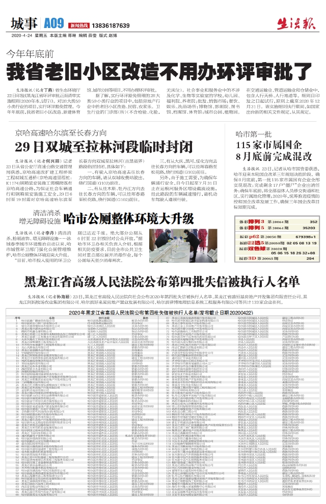 生活报讯(记者孙海颖)23日,黑龙江省高级人民法院向社会公布2020年第四批失信被执行人名单,黑龙江省盛恒基房地产开发集团有限责任公司、黑龙江阿妈牧场农业集团有限公司、哈尔滨好来屋房地产置业发展有限公司、哈尔滨律博地理信息系统工程服务有限公司等共计133家企业在列。 2020年黑龙江省高级人民法院公布第四批失信被执行人名单(发布截止日期20200422) 序号 名称 执行法院 案由 1哈尔滨鑫广鹏商贸有限公司 哈尔滨铁路运输法院 租赁合同纠纷 2哈尔滨欢乐口腔门诊有限公司 佳木斯铁路运输法院 劳动争议 3绥化市富贵精制米有限责任公司 绥化市北林区人民法院 买卖合同纠纷 4黑龙江瑞丰源米业有限公司 宝泉岭人民法院 保证合同纠纷 5鹤岗市和鑫仓储有限公司 宝泉岭人民法院 保证合同纠纷 6黑龙江省建三江农垦华龙粮油食品加工有限责任公司 建三江人民法院 劳动争议 7黑龙江省建三江农垦龙兴米业有限责任公司 建三江人民法院 劳务合同纠纷 8大庆久隆化工科技开发有限公司 大庆高新技术产业开发区人民法院 买卖合同纠纷 9黑龙江丽辉建筑工程有限公司 大庆高新技术产业开发区人民法院 房屋买卖合同纠纷10齐齐哈尔农垦鑫宇工程服务有限公司 九三人民法院 建设工程合同纠纷11克山天源食品有限公司 绥北人民法院 借款合同纠纷 12黑龙江省富鹏木业有限公司 黑龙江省高级人民法院 其他案由 13中绿融资担保有限公司 黑龙江省高级人民法院 其他案由 14黑龙江阿妈牧场农业集团有限公司 黑龙江省高级人民法院 其他案由 15黑龙江中农欣欣农业科技发展有限公司 黑龙江省高级人民法院 建设工程合同纠纷16鸡西龙嘉投资集团有限公司 黑龙江省高级人民法院 合同纠纷 17首创龙基科技有限公司 黑龙江省高级人民法院 合同纠纷 18黑龙江远东木业有限公司 黑龙江省高级人民法院 借款合同纠纷 19满洲里铁丰木业有限公司 黑龙江省高级人民法院 借款合同纠纷 20洛德控股集团有限公司 黑龙江省高级人民法院 借款合同纠纷 21哈尔滨哈轴通用轴承制造有限公司 黑龙江省高级人民法院 借款合同纠纷 22黑龙江省盛恒基房地产开发集团有限责任公司 黑龙江省高级人民法院 其他案由 23黑龙江丰熙集团宏安房地产开发有限公司 黑龙江省高级人民法院 借款合同纠纷 24三洲隆徽实业有限公司 黑龙江省高级人民法院 其他案由 25黑龙江红兴隆农垦弘盛粮油加工有限公司 黑龙江省高级人民法院 借款合同纠纷 26黑龙江安邦房地产开发有限公司 黑龙江省高级人民法院 建设工程合同纠纷27金安桥水电站有限公司 黑龙江省高级人民法院 融资租赁合同纠纷28黑龙江购百特便利店管理有限公司 哈尔滨市中级人民法院 其他案由 29哈尔滨群力沿江项目运营管理有限公司 哈尔滨市道里区人民法院 租赁合同纠纷 30哈尔滨市康悦商贸有限公司 哈尔滨市道里区人民法院 劳动争议 31哈尔滨金中环综合菜市场有限公司 哈尔滨市道里区人民法院 租赁合同纠纷 32哈尔滨市百氏佳居网络科技有限公司 哈尔滨市道里区人民法院 劳动争议 33哈尔滨好来屋房地产置业发展有限公司 哈尔滨市道里区人民法院 房屋买卖合同纠纷34哈尔滨市爱诺广告设计有限公司 哈尔滨市道里区人民法院 劳动争议 35京农数字时代科技(哈尔滨)有限公司 哈尔滨市道里区人民法院 劳动争议 36哈尔滨联盟出租汽车股份有限公司 哈尔滨市南岗区人民法院 追偿权纠纷 37国信卓越信息咨询有限公司 哈尔滨市南岗区人民法院 劳动争议 38黑龙江禧年房地产开发集团股份有限公司 哈尔滨市南岗区人民法院 建设工程合同纠纷39哈尔滨市天文物业供热管理有限责任公司 哈尔滨市南岗区人民法院 侵权 40黑龙江省英迈运输有限公司 哈尔滨市道外区人民法院 劳动争议 41黑龙江大军有机农业发展有限公司 哈尔滨市道外区人民法院 借款合同纠纷 42哈尔滨国之裕米业有限公司 哈尔滨市道外区人民法院 借款合同纠纷 43黑龙江飞冠科技有限公司 哈尔滨市道外区人民法院 借款合同纠纷 44通河鸿鑫电子商务有限公司 哈尔滨市道外区人民法院 机动车交通事故责任纠纷45哈尔滨环琪商贸有限公司 哈尔滨市松北区人民法院 租赁合同纠纷 46哈尔滨毅次元文化传播有限公司 哈尔滨市松北区人民法院 罚金 47康吉国际投资有限公司 哈尔滨市松北区人民法院 与公司有关的纠纷48哈尔滨元德高新技术股份有限公司 哈尔滨市松北区人民法院 服务合同纠纷 49哈尔滨市盛恒基建筑工程有限公司 哈尔滨市松北区人民法院 承揽合同纠纷 50佳木斯龙嘉农机制造有限公司 哈尔滨市松北区人民法院 合同纠纷 51哈尔滨昊旭技术有限公司 哈尔滨市松北区人民法院 劳务合同纠纷 52黑龙江省中材桩基础工程有限责任公司 哈尔滨市香坊区人民法院 建设工程合同纠纷53哈尔滨律博地理信息系统工程服务有限公司 哈尔滨市香坊区人民法院 劳动争议 54哈尔滨汉晟工业装备制造有限公司 哈尔滨市香坊区人民法院 劳务合同纠纷 55黑龙江省冶金建设总公司 哈尔滨市香坊区人民法院 租赁合同纠纷 56齐齐哈尔乾嘉木制品有限公司 哈尔滨市香坊区人民法院 买卖合同纠纷 57哈尔滨华满房地产经纪有限责任公司 哈尔滨市香坊区人民法院 劳动争议 58哈尔滨晨龙奥格建筑装饰材料有限公司 哈尔滨市香坊区人民法院 买卖合同纠纷 59黑龙