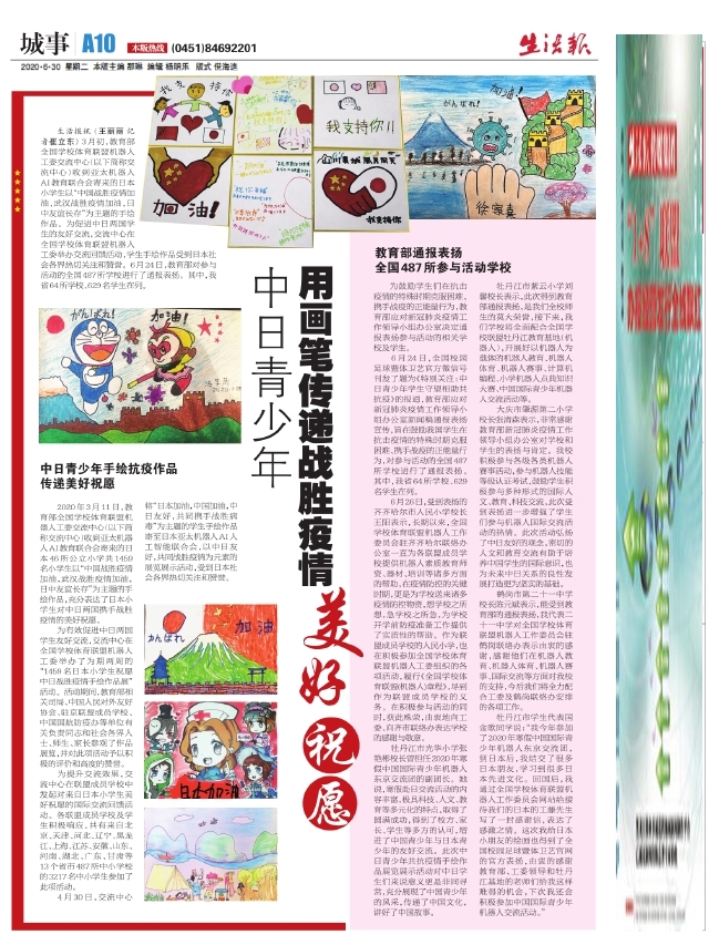 生活报讯(王丽丽记者崔立东)3月初,教育部全国学校体育联盟机器人工委交流中心(以下简称交流中心)收到亚太机器人AI教育联合会寄来的日本小学生以“中国战胜疫情加油,武汉战胜疫情加油,日中友谊长存”为主题的手绘作品。为促进中日两国学生的友好交流,交流中心在全国学校体育联盟机器人工委举办交流回馈活动,学生手绘作品受到日本社会各界热切关注和赞誉。6月24日,教育部对参与活动的全国487所学校进行了通报表扬。其中,我省64所学校、629名学生在列。 中日青少年手绘抗疫作品传递美好祝愿 2020年3月11日,教育部全国学校体育联盟机器人工委交流中心(以下简称交流中心)收到亚太机器人AI教育联合会寄来的日本46所公立小学共1459名小学生以“中国战胜疫情加油,武汉战胜疫情加油,日中友谊长存”为主题的手绘作品,充分表达了日本小学生对中日两国携手战胜疫情的美好祝愿。 为有效促进中日两国学生友好交流,交流中心在全国学校体育联盟机器人工委举办了为期两周的“1459名日本小学生祝愿中日战胜疫情手绘作品展”活动。活动期间,教育部相关司局、中国人民对外友好协会、驻京联盟成员学校、中国国航防疫办等单位有关负责同志和社会各界人士、师生、家长参观了作品展览,并对此项活动予以积极的评价和高度的赞誉。 为提升交流效果,交流中心在联盟成员学校中发起对来自日本小学生美好祝愿的国际交流回馈活动。各联盟成员学校及学生积极响应,共有来自北京、天津、河北、辽宁、黑龙江、上海、江苏、安徽、山东、河南、湖北、广东、甘肃等13个省市487所中小学校的3217名中小学生参加了此项活动。 4月30日,交流中心将“日本加油,中国加油,中日友好,共同携手战胜病毒”为主题的学生手绘作品寄至日本亚太机器人AI人工智能联合会,以中日友好,共同战胜疫情为元素的展览展示活动,受到日本社会各界热切关注和赞誉。 教育部通报表扬 全国487所参与活动学校 为鼓励学生们在抗击疫情的特殊时期克服困难、携手战疫的正能量行为,教育部应对新冠肺炎疫情工作领导小组办公室决定通报表扬参与活动的相关学校及学生。 6月24日,全国校园足球暨体卫艺官方微信号刊发了题为《特别关注:中日青少年学生守望相助共抗疫》的报道,教育部应对新冠肺炎疫情工作领导小组办公室新闻稿通报表扬宣传,旨在鼓励我国学生在抗击疫情的特殊时期克服困难、携手战疫的正能量行为,对参与活动的全国487所学校进行了通报表扬。其中,我省64所学校、629名学生在列。 6月26日,受到表扬的齐齐哈尔市人民小学校长王阳表示,长期以来,全国学校体育联盟机器人工作委员会驻齐齐哈尔联络办公室一直为各联盟成员学校提供机器人素质教育师资、器材、培训等诸多方面的帮助,在疫情防控的关键时期,更是为学校送来诸多疫情防控物资,想学校之所想,急学校之所急,为学校开学前防疫准备工作提供了实质性的帮助。作为联盟成员学校的人民小学,也在积极参加全国学校体育联盟机器人工委组织的各项活动,履行《全国学校体育联盟(机器人)章程》,尽到作为联盟成员学校的义务。在积极参与活动的同时,获此殊荣,由衷地向工委、向齐市联络办表达学校的感谢与敬意。 牡丹江市光华小学张艳彬校长曾担任2020年寒假中国国际青少年机器人东京交流团的副团长。她说,寒假赴日交流活动的内容丰富,极具科技、人文、教育等多元化的特点,取得了圆满成功,得到了校方、家长、学生等多方的认可,增进了中国青少年与日本青少年的友好交流。此次中日青少年共抗疫情手绘作品展览展示活动对中日学生们来说意义更是非同寻常,充分展现了中国青少年的风采,传递了中国文化,讲好了中国故事。 牡丹江市紫云小学刘馨校长表示,此次得到教育部通报表扬,是我们全校师生的莫大荣誉,接下来,我们学校将全面配合全国学校联盟牡丹江教育基地(机器人),开展好以机器人为载体的机器人教育、机器人体育、机器人赛事、计算机编程、小学机器人点典知识大赛、中国国际青少年机器人交流活动等。 大庆市肇源第二小学校长张清森表示,非常感谢教育部新冠肺炎疫情工作领导小组办公室对学校和学生的表扬与肯定。我校积极参与各级各类机器人赛事活动,参与机器人技能等级认证考试,鼓励学生积极参与多种形式的国际人文、教育、科技交流,此次受到表扬进一步增强了学生们参与机器人国际交流活动的热情。此次活动弘扬了中日友好的观念,密切的人文和教育交流有助于培养中国学生的国际意识,也为未来中日关系的良性发展打造更为坚实的基础。 鹤岗市第二十一中学校长陈元斌表示,能受到教育部的通报表扬,我代表二十一中学对全国学校体育联盟机器人工作委员会驻鹤岗联络办表示由衷的感谢,感谢他们在机器人教育、机器人体育、机器人赛事、国际交流等方面对我校的支持,今后我们将全力配合工委及鹤岗联络办安排的各项工作。 牡丹江市学生代表国金歌同学说:“我今年参加了2020年寒假中国国际青少年机器人东京交流团,到日本后,我结交了很多日本朋友,学习到很多日本先进文化。回国后,我通过全国学校体育联盟机器人工作委员会网站给接待我们的日本的工藤先生写了一封感谢信,表达了感激之情。这次我给日本小朋友的绘画也得到了