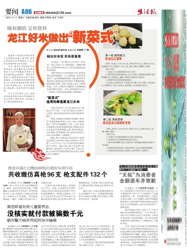 实习生杨金明郭安琦本报记者孟薇薇文/摄 随着第八届黑龙江绿色食品产业博览会和第三届中国·黑龙江省国际大米节的临近,广大市民也越来越关注本次盛会。 近日,有多位市民拨打记者热线表示,生活报和龙头新闻近期关于大米节的报道非常好,坐在家里就能get新厨艺。市民张阿姨表示,她尝试为家人做了五谷杂粮饭、五彩蔬菜饭和排骨肉肠饭,家人品尝后都连连称赞,想请烹饪大师再教几招。大米节的时候,再选购一些今年新产的稻花香。 应广大市民要求,16日,本报记者邀请中国烹饪大师栾瑞滨讲述如何焖一锅好米饭,并且教大家几款米饭的新吃法。 焖出好米饭炊具很重要 俗话说:“巧妇难为无米之炊”,然而有了龙江好米之后,要想蒸出一锅既有颜值、又有营养的米饭,对于炊具的选择也是尤其重要。 据中国烹饪大师栾瑞滨介绍,焖米饭建议选用锅壁厚一点儿的锅具,有高压就更好了,这种锅保温效果好,能让锅内的米饭保持在高温高压的环境中不散发热量,瞬间锁住营养,这样才是真正意义上的焖米饭。而且,米饭用石锅焖比用金属锅焖出来的更为美味。另外,焖米饭时少加入一些粘米,米饭会更加软糯,米味浓郁。 “新菜式”选用的都是黑龙江大米 “民以食为天”,作为主食的大米,更是必不可少的。平时只听说过中国有八大菜系,却从来没有听说过米饭有很多种做法。 现场,栾瑞滨大师教大家做的“新菜式”选用的都是黑龙江大米,对此,栾瑞滨表示:“作为中国粳稻生产第一大省,黑龙江有着得天独厚的地理优势,种植出来的大米富含多各种微量元素,营养价值高。米粒饱满、晶莹剔透,蒸出来的米饭洁白光润、品味香醇、口感极佳。” 据悉,第八届黑龙江绿色食品产业博览会和第三届中国·黑龙江省国际大米节将于10月18日—22日在哈尔滨会展体育中心举办。届时,线上线下同步进行直播售卖,还将举办“世界百米汇”展示活动,100种不同国家和地区的优质大米将让您大开眼界。 第一款嫩滑爽口 【稻香鲜虾丸】 原料:黑龙江大米200克、鮮虾肉300克、肥肉100克、鸡蛋清50克、葱姜汁30克、盐、糖、鸡粉、胡椒粉、料酒 制作方法: 1、黑龙江大米提前用水泡4小时。 2、鲜虾肉去除虾线洗净,用刀拍碎,将肥肉剁成茸与虾肉搅拌加入调味料、蛋清、葱姜汁揽拌均匀即可。 3、将搅拌好的虾胶团成圆形。 4、把泡过的香米用干净的毛巾擦干水分铺平,取出虾丸,粘裹均匀,放入容器入蒸钢落12分钟取出即可。 第二款清爽营养 【稻香米烫松茸小油菜】 原料:黑龙江大米200克、松茸100克、油菜400克、盐、糖、鸡粉、黄油 制作方法: 1、黑龙江大米做成粥加水过滤,留用米汤。 2、松茸切片后用黄油轻轻煎至待用。 3、锅中放油烧热,放入切好的小油菜编炒调味放在漏勺中待用。 4、将煎好的松茸放入米汤中煮开,加入油菜再次调味。 5、把做好的菜品放入汤盘中,松茸放在上面即可。