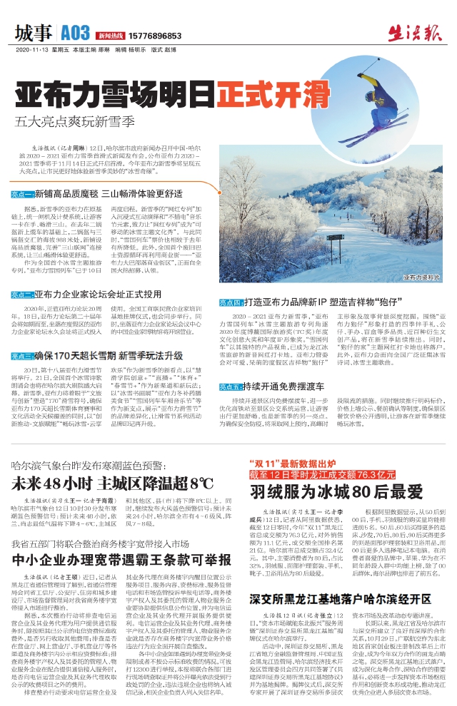 生活报讯(记者周琳)12日,哈尔滨市政府新闻办召开中国·哈尔滨2020-2021亚布力雪季首滑式新闻发布会,公布亚布力2020-2021雪季将于11月14日正式开启首滑。今年亚布力新雪季将呈现五大亮点,让市民更好地体验新雪季美妙的“冰雪奇缘”。 亮点一:新铺高品质魔毯三山畅滑体验更舒适 据悉,新雪季的亚布力在原基础上,统一闸机及计费系统,让游客一卡在手、畅滑三山。在去年二锅盔新上缆车的基础上,二锅盔与三锅盔交汇的海拔988米处,新铺设高品质魔毯,完善“三山联网”连接系统,让三山畅滑体验更舒适。 作为全国首个冰雪主题旅游专列,“亚布力雪国列车”已于10日再度启程。新雪季的“网红专列”加入沉浸式互动演绎和“不插电”音乐节元素,致力让“网红专列”成为“可移动的冰雪主题文化秀”。与此同时,“雪国列车”票价也相较于去年有所降低。此外,全国首个废旧巴士资源循环再利用商业街——“亚布力大巴部落商业街区”,正面向全国火热招募、认领。 亮点二:亚布力企业家论坛会址正式投用 2020年,正值亚布力论坛20周年。18日,亚布力论坛第二十届年会将如期而至,坐落在度假区的亚布力企业家论坛永久会址将正式投入使用。全国工商联民营企业家培训基地挂牌仪式,也会同步举行。同时,坐落亚布力企业家论坛会议中心的中国企业家博物馆将开馆营业。 亮点三:确保170天超长雪期新雪季玩法升级 20日,第十八届亚布力滑雪节将举行。21日,全国首个冰雪诗歌朗诵会也将在哈尔滨大剧院盛大启幕。新雪季,亚布力将着眼于“文旅与创新”塑造“170”滑雪符号,确保亚布力170天超长雪期体育赛事和文化活动全天候覆盖的同时,以“创新推动·文旅赋能”“畅玩冰雪·云享欢乐”作为新雪季的新看点,以“慧滑学院创意+”“直播+”“体育+”“春雪节+”作为新渠道和新玩法;以“冰雪书画展”“亚布力冬补药膳美食节”“雪国列车车厢音乐节”等作为新支点,展示“亚布力滑雪节”的品牌差异化,让滑雪节系列活动品牌印记再升级。 亮点四:打造亚布力品牌新I P塑造吉祥物“狍仔” 2020-2021亚布力新雪季,“亚布力雪国列车”冰雪主题旅游专列角逐2020年度博鳌国际旅游奖(TC奖)年度文化创意大奖和年度I P形象奖。“雪国列车”以其独特的产品视角,已成为龙江冰雪旅游的新晋网红打卡地。亚布力管委会对可爱、呆萌的度假区吉祥物“狍仔”主形象及故事背景深度挖掘。围绕“亚布力狍仔”形象打造的四季伴手礼、公仔、手办、盲盒等多品类、近百种衍生文创产品,将在新雪季陆续推出。同时,“狍仔的家”主题网红打卡地也将落户。此外,亚布力会面向全国广泛征集冰雪诗词、冰雪主题歌曲。 亮点五:持续开通免费摆渡车 持续开通景区内免费摆渡车,进一步优化高铁站至景区公交系统运营,让游客出行更加舒畅,也是新雪季的另一亮点。为确保安全防疫,将采取网上预约,高峰时段限流的措施。同时继续推行明码标价,价格上墙公示、餐前确认等制度,确保景区餐饮价格公开透明,让游客在新雪季继续畅玩冰雪。
