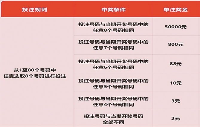 “选八”玩法。若投注号码与当期开奖号码中的任意八个号码相同,即中奖,单注中奖金额50000元;若投注号码与当期开奖号码中的任意七个号码相同,即中奖,单注中奖金额800元;若投注号码与当期开奖号码中的任意六个号码相同,即中奖,单注中奖金额88元;若投注号码与当期开奖号码中的任意五个号码相同,即中奖,单注中奖金额10元;若投注号码与当期开奖号码中的任意四个号码相同,即中奖,单注中奖金额3元;若投注号码与当期开奖号码全部不同,即中奖,单注中奖金额2元。