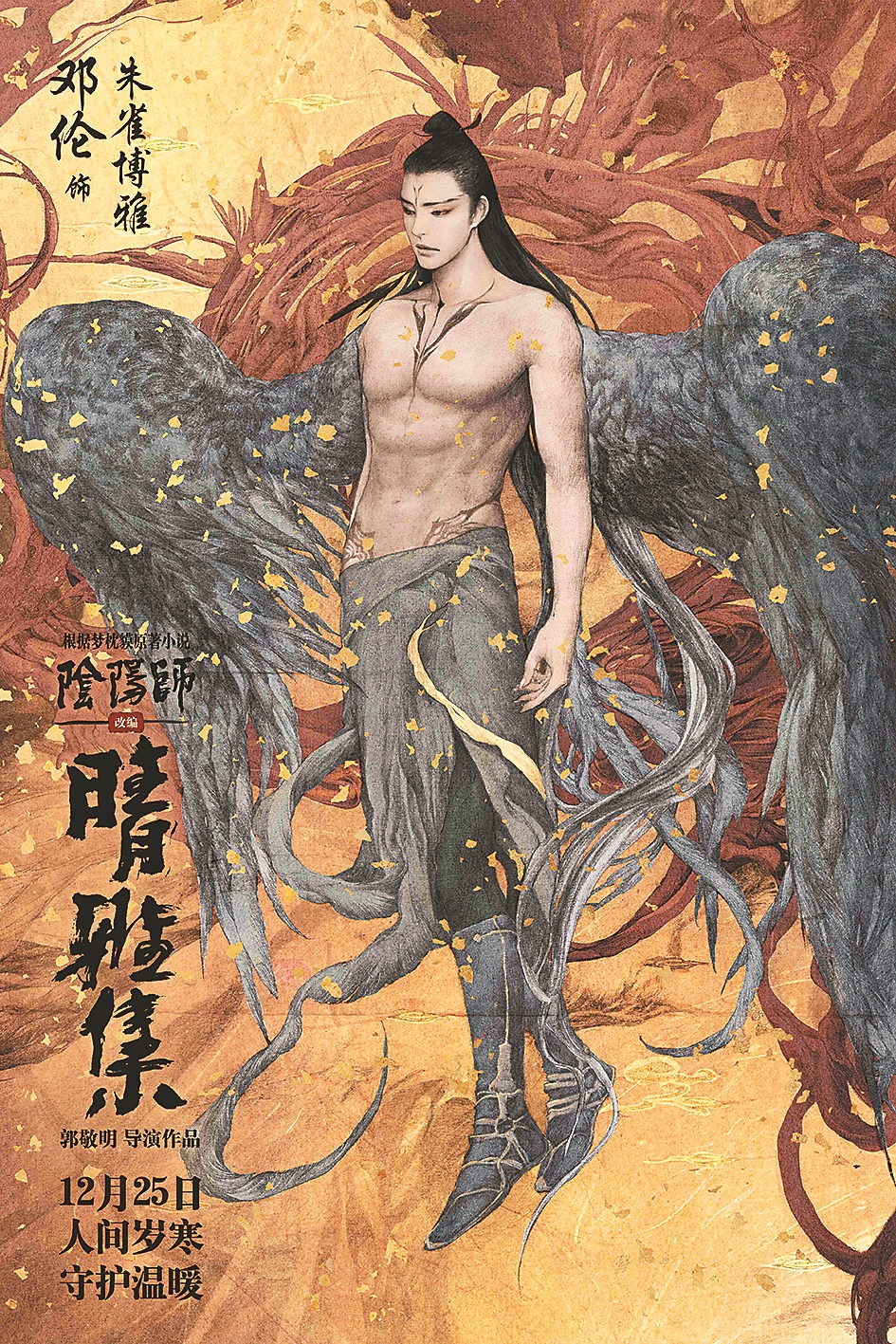 生活报讯(记者 王雪莹)作为今年贺岁档唯一一部东方奇幻题材作品,由郭敬明执导,赵又廷、邓伦、王子文等人主演的《晴雅集》将于12月25日上映。近日,该片曝光了一组“式神”剧照与手绘海报。记者看到,孙晨竣饰演的“杀生石”、徐开骋饰演的“狂画师”,欧米德饰演的“雪天狗”,以及芦展翔饰演的“金灵子”均手持特色武器登场。邓伦则化身“朱雀”,其神兽造型引发了网友对正片的遐想。
