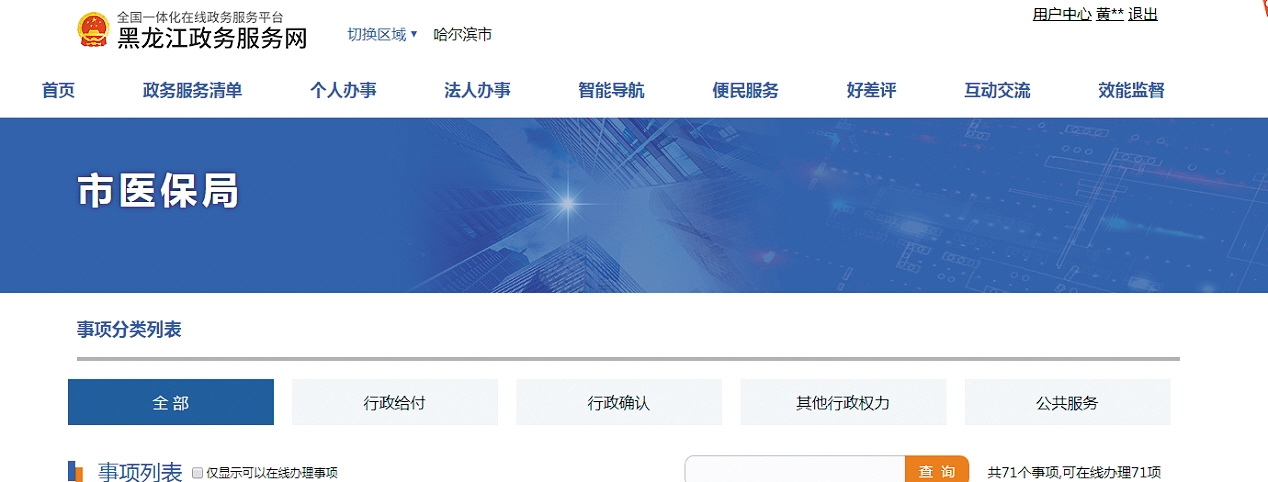 (2)选择哈尔滨市-市医保局 进入哈尔滨市政务服务事项界面。