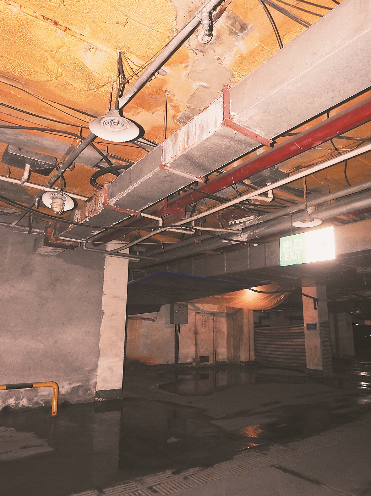 记者看到,在车库内不少区域都有大张五彩布搭建的“遮雨棚”,就在车辆上方。车主无奈地告诉记者,这是没有办法的办法,天棚总往下掉水滴,几乎都带有锈迹和污渍,掉在车上会损害车辆。记者顺着车主的指引看到,天棚部位的一些管线锈蚀严重,外部有水滴形成,不时滴落。
