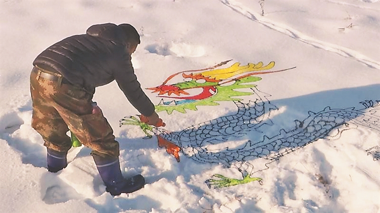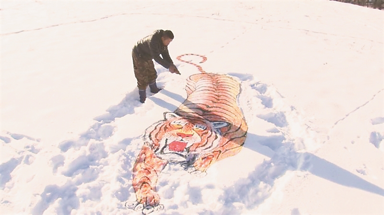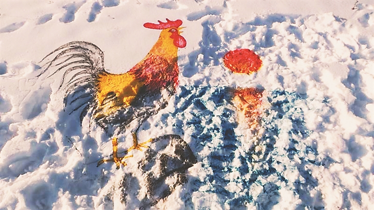 另外,温度也是雪地画的关键所在,吴师傅总结的经验是,室外温度在零下15摄氏度左右最佳,高于这个温度,颜料落到雪地上洇得特别快,影响造型的准确性。