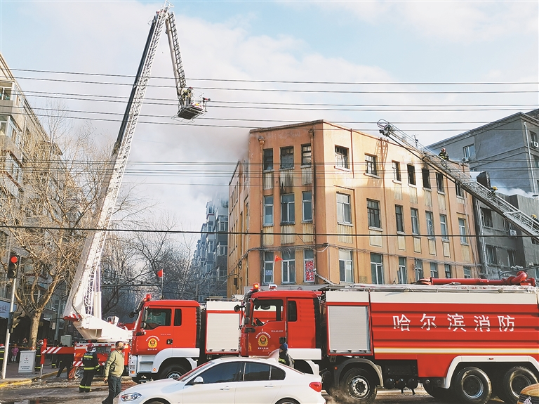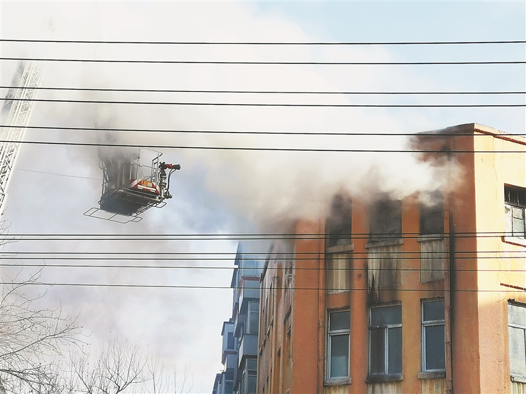 当日中午,记者在现场看到,位于街口的这幢4层橙黄色老楼上部还冒着烟,消防人员乘坐云梯在楼顶进行灭火作业。同时,与该楼相邻的一幢相对矮一些的4层灰色老楼上部也冒着浓烟。从楼下可以看到,该楼顶层房盖已经塌落,消防人员正在展开灭火作业。起火的两处相邻老楼的一楼临街一侧都是商服,门窗上部牌匾上的流水已经结成了冰。在两楼后侧位于居民区一侧,几组消防人员正在进行灭火作业,高压水柱向起火点猛烈打击,楼顶的浓烟还在升腾。