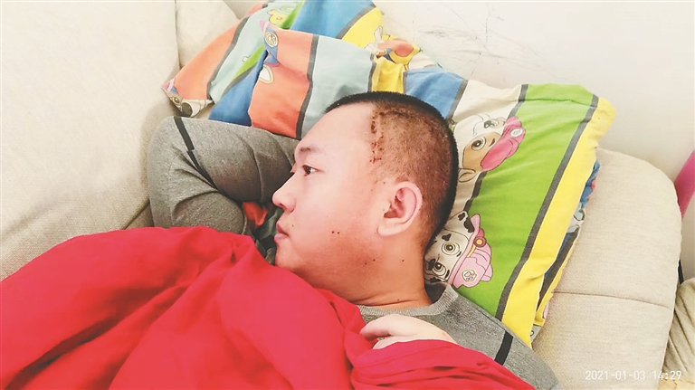由于刚做的开颅手术,所以他只能在床上侧躺。从他头部太阳穴的位置可以看到,有一个长达20多厘米的三角口子,这是开颅手术缝合的伤口。