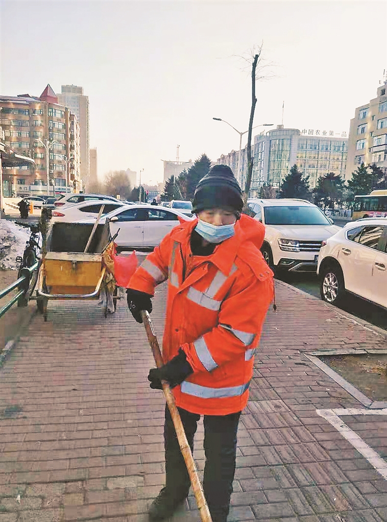 1日凌晨四点,作为香坊区环境卫生清洁中心六顺中队珠江路组组长的舒永军上岗了。十年工龄,在55岁的舒永军的印象中,似乎今天的天气更冷一些。在阖家团圆时,作为冰城数万名城市美容师的一员,舒永军手持扫把开始清理作业区,极寒天气,吐出的热气迅速在他围巾外部凝结成冰晶,采访十分钟不到,记者的双颊已经有了刀割般的刺痛感,舒永军却不以为然,笑眯眯地说着,“习惯了”。
