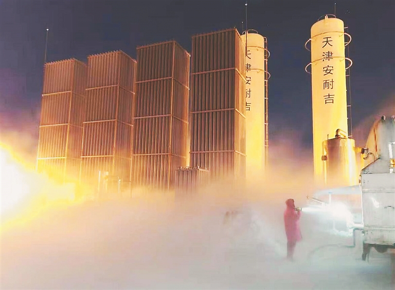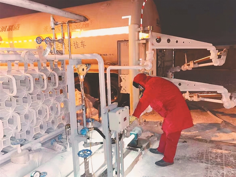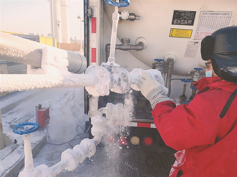 李露是平房LNG应急气源站的站长。4日,记者来到气源站,李露正在把罐车上的液态天然气存储到气罐里,他站在3米高的罐车旁,紧盯着车后的仪表。连接罐车和气罐的管线上结了厚厚的一层白霜,还在不停地冒着气。李露告诉记者,液态天然气的温度是零下162摄氏度,因为温度太低,在传输过程中,这些液态天然气会吸收周围大量的热量,使周围温度变得比其他地方低十几摄氏度,这些管线上就会冒气、结霜。操作的时候必须帽子、手套全副武装,不然很容易被冻伤。“送气的时候,这附近的温度会比气温低十几摄氏度,尤其是晚上,最近这几天晚上都是将近零下30摄氏度,如果送气的车多,这附近就得有零下40多摄氏度。必须穿得厚一点,虽然行动比较不方便,但必须保证安全。”