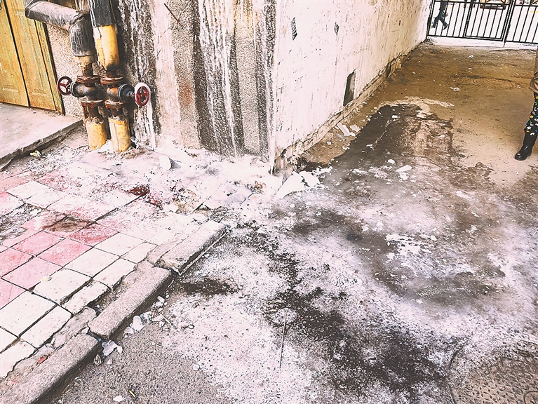 “这墙上、地上都是冰,小区院里多数都是老年人,滑倒了可不是闹着玩儿的,大门洞顶部还有冰溜子,万一掉下来砸到人可咋办?”2020年12月29日,家住太古小区的吕女士告诉记者,不知从什么时候开始,该小区大门洞附近的墙面上,都是上面漏下来的水形成的冰,大门洞上方有冰溜子,地上有冰,这里是进出小区的必经之地,给物业打电话始终打不通。“天黑时,大门洞这里也没有灯,我上次差点在这滑倒了。”吕女士说。