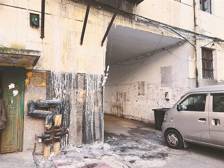 当日,记者来到太古小区,在吕女士的带领下来到小区大门洞看到,小区门右侧的4号楼二楼阳台漏水,形成的积冰把墙体变成一面“冰墙”,小区大门洞上方悬挂着冰溜,地面上也有一大片冰。门洞并不宽阔,地面积冰就占了大半,仅剩下一小部分干净路面。
