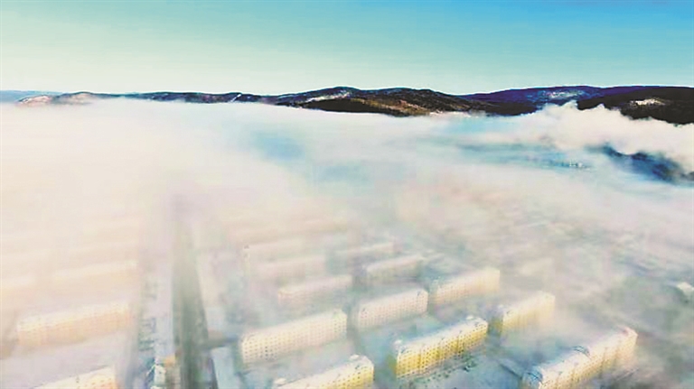 由于低温,早上整个呼中小城笼罩在浓浓的冰雾之中,街头巷尾冰雾弥漫,能见度不足100米,直到10时冰雾还未散去,行驶车辆纷纷开启示宽灯减速慢行,街上行人加快了脚步,呼出的哈气瞬间凝成了霜花。