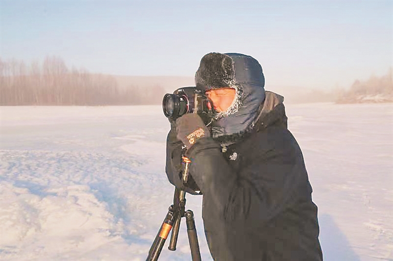 呼中区摄影家协会会员张雷天没亮就来到了呼玛河沿岸,找好摄影位置,等待拍摄,他拿着相机兴奋地说:“今天出来得早,镜头都被冻上了霜,但在极寒天气下,伴着晨光和冰雾,拍到了自己想要的片子,感觉挨冻也值得。”