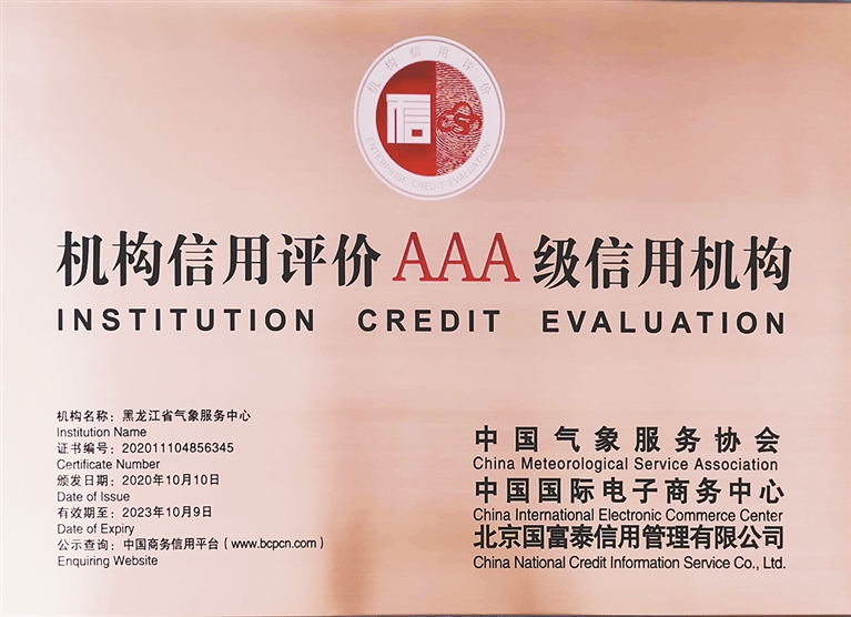 生活报讯 (黄英伟 实习生王一 记者何兴丽) 日前,中国气象服务协会对气候资源评估机构进行2020年第二期的信用评价,黑龙江省气象服务中心参加并荣获气候资源评估机构最高等级AAA级证书资质。据悉,全国仅有7家气候资源评估机构获AAA最高信用等级。