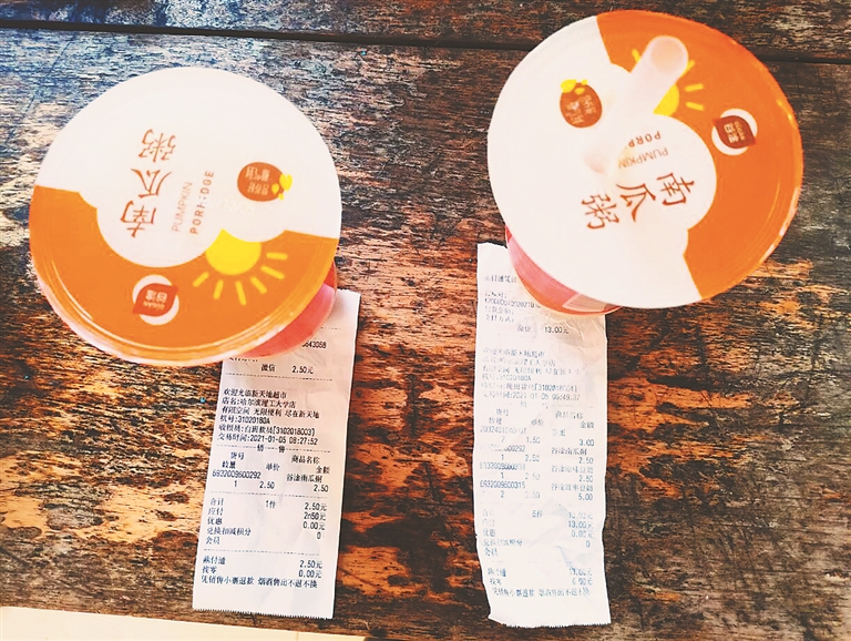 5日下午,记者见到王先生,他拿出两杯南瓜粥和两张购物小票。其中一杯已经喝了一半,另一杯没有开封。王先生告诉记者,自己早上去新天地超市买了一杯南瓜粥,回来喝了几口,觉得味道不对劲,感觉好像变质了。王先生就又去该超市买了一杯南瓜粥,拿回来之后发现,刚买的这杯南瓜粥杯口处印着生产日期是10月5日,他又看刚才买的那杯南瓜粥,封口处并没有生产日期。