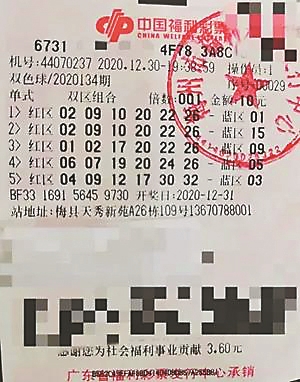 2020年12月31日,福彩双色球2020134期开奖,开奖号码红球为02、09、10、20、22、26,蓝球为01。当期全国中出48注一等奖,广东中出2注一等奖,其中有1注花落梅州市。