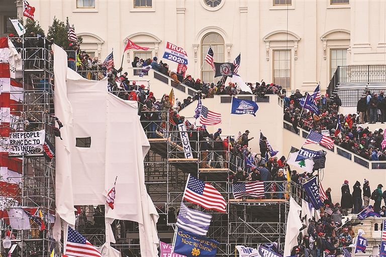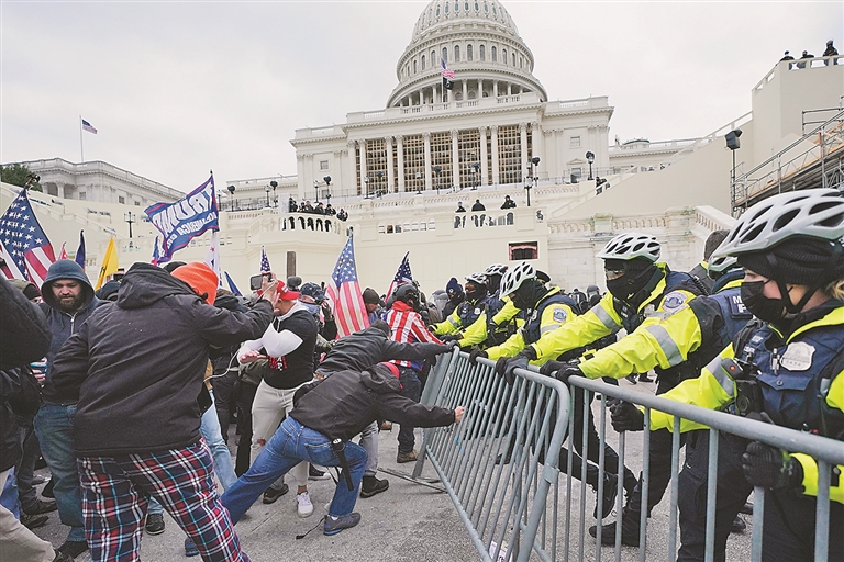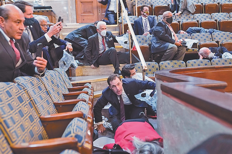 据新华社电 美国出!大!事!了!当地时间6日本来是美国会参众两院举行联席会议确认拜登当选总统的大日子,然而大批特朗普支持者涌入华盛顿特区,暴力冲击美国国会大厦,导致现场一片混乱。有的示威者冲破围栏,一路冲进国会大厦;有人手持棍棒,砸碎玻璃窗爬进国会大厦;也有人沿着外墙爬上大厦楼顶;有的示威者甚至闯进美众议院议长佩洛西办公室,坐椅子上高调摆拍;有的示威者与持枪的安保人员对峙,国会大厦内一度传出枪声……