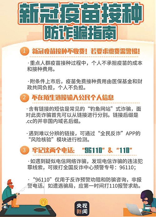 据央视新闻报道 近日,新冠疫苗开始走进人们的生活,然而有些不法分子却趁机钻空子,蹭疫苗的“热度”实施诈骗,快来识破这些新型诈骗手段!