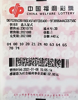 生活报讯 (记者李丹) 新年伊始,龙江彩市不断传来喜讯,2021年1月7日双色球玩法刚刚中出两个九百多万元的大奖,1月8日,“快乐8”游戏也紧随其后,中出了2021年我省的第一注大奖,哈尔滨一位年过七旬老彩民凭借一张选九复式,成功中得1注选九中九,加上其他小奖,共计奖金377280元。