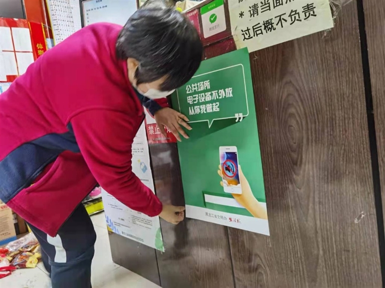 13日,在哈尔滨市香坊区的一家福彩发行站点,工作人员正在往墙上粘贴“手机不外放”宣传海报。“以前,有的彩民在屋里用外放接打电话,还刷抖音,声音可大了,影响到其他彩民。”一站点负责人刘女士表示,遇到这种情况只能劝劝,现在好了,有了海报后,不用劝了,彩民看到海报就能自觉遵守了。