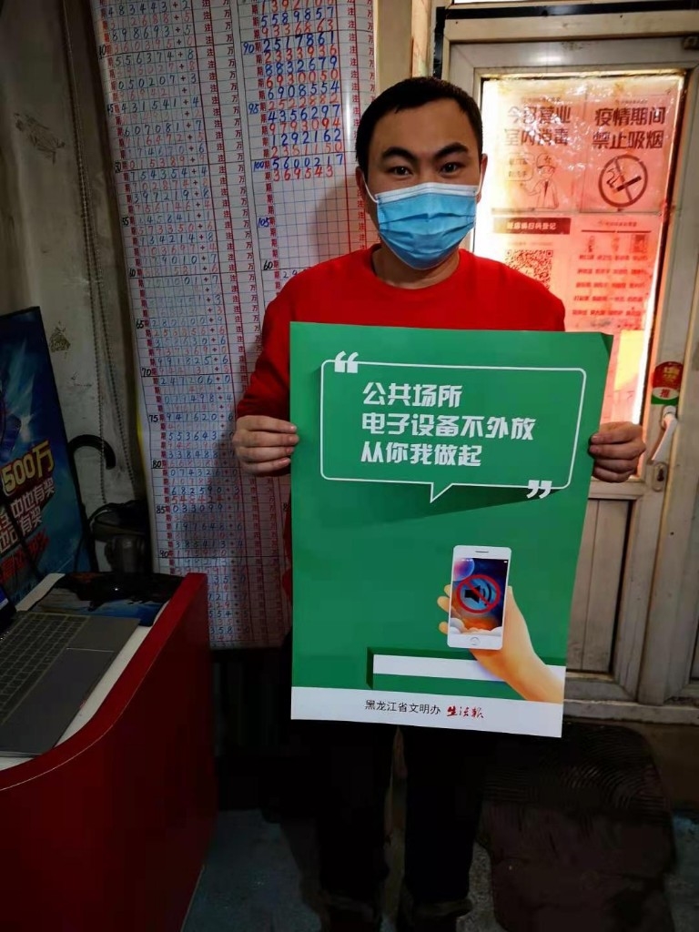 哈尔滨市民政局福利彩票发行中心宣传部长吴春阳告诉记者,他们得知黑龙江省文明办和生活报联合开展“手机不外放”公益宣传活动后,第一时间与单位负责人进行了沟通,参与到这个活动中来,将在哈尔滨市主城区的600个站点都张贴“手机不外放”宣传海报,倡导所有的彩民在公共场所使用电子设备时不外放声音,做一个文明彩民。