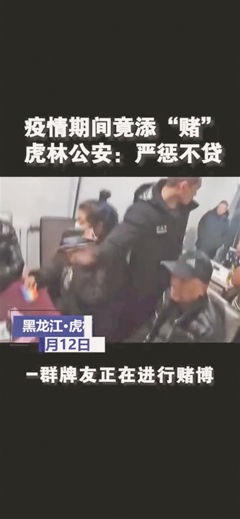 12日,鸡西市虎林公安局治安大队民警在工作中发现,在虎林市中心北街十九巷4号的一处平房内,烟熏雾绕,两桌牌友激战正酣,且没有一人佩戴口罩。原来,违法行为人李某组织金某、孙某、任某等人用扑克玩“拖拉机”进行赌博。民警责令参赌人员迅速停止违法行为,并当场收缴赌资、赌具。