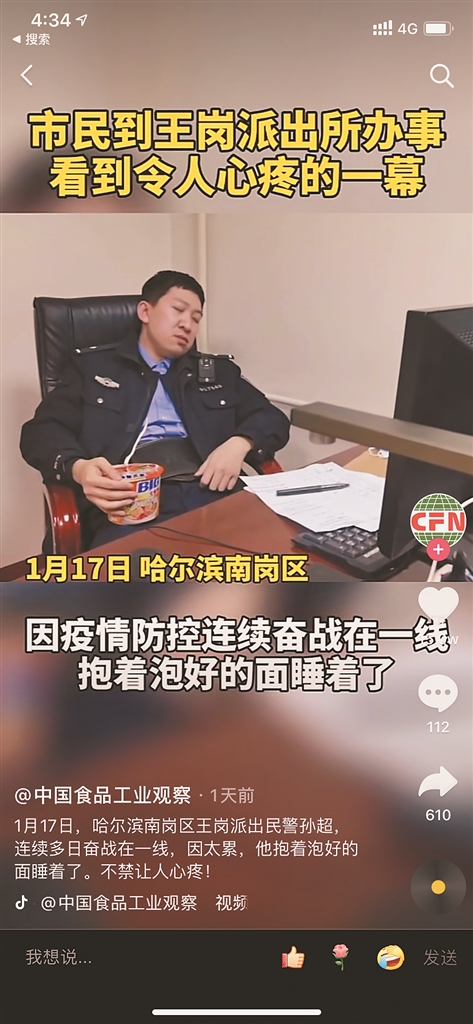 生活报讯 (记者黄迎峰) 19日下午,一个抖音视频传遍了朋友圈。这是一位市民随手记录下的画面,画面中,一位民警右手抱着一碗泡面在椅子睡着了,办公桌上还放着核查名单。字幕上,居民深情地记录到:“市民来王岗派出所办事看到令人心碎的一幕,因疫情防控连续奋战在一线,抱着泡面睡着了。”