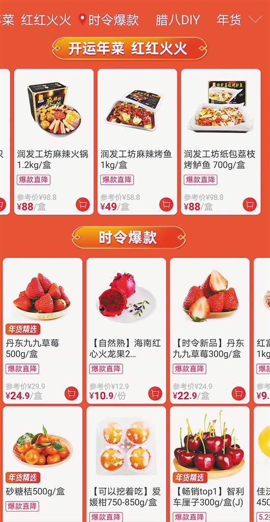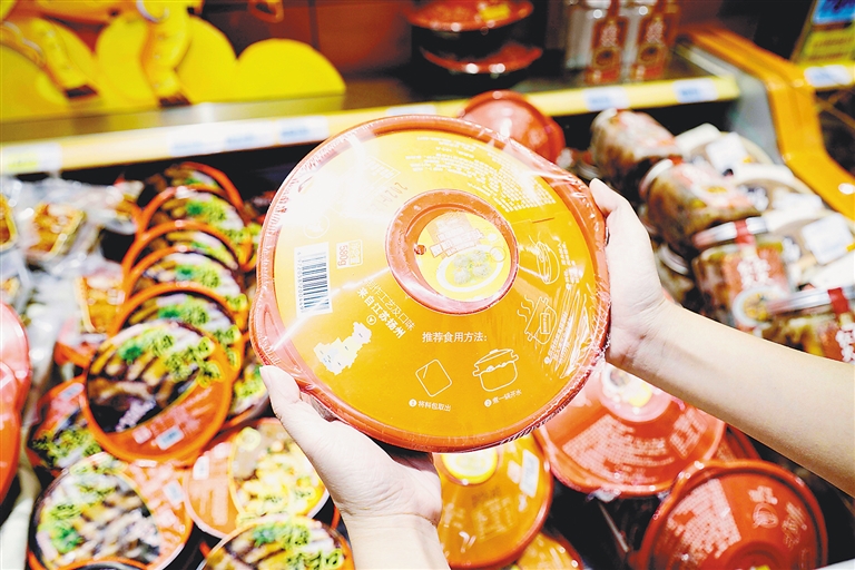 14时,市民张女士在大润发年菜柜台前频频“下手”。“今年过年不出门了,以往年菜光忙活备料就得大半天,有了这个半成品,一加热就可以吃了,而且摆盘精美,还真挺有过年的气氛。”得知在淘宝APP进入淘鲜达就可以实现线上下单,张女士立刻表示要把这些年菜推荐给身边的朋友。