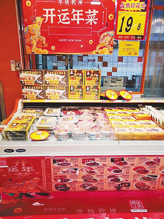“过年就不出去吃了,准备买些菜在家里做,没想到现在超市居然还有这些半成品,看着卖相不错,分量大还省事,这年夜饭就丰富了。”受疫情影响,不少原本在饭店订好了年夜饭的市民选择回到家中团聚。而超市里制作精美、营养美味的半成品“年菜”成为了冰城市民的新宠。