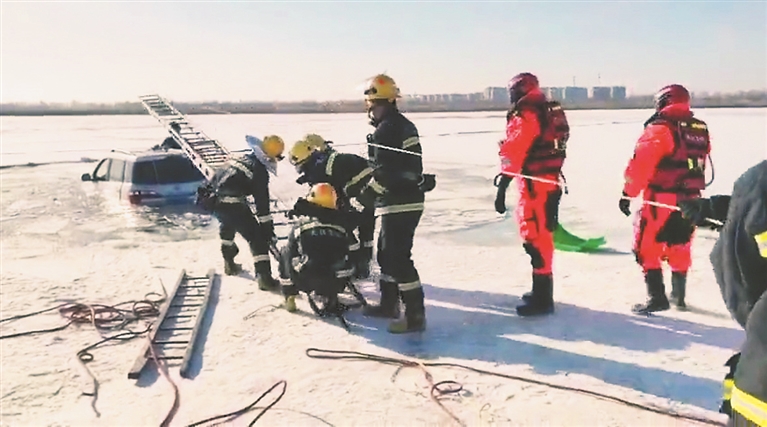 16日12时43分,大庆消防部门接到报警,龙凤湿地公园水域一辆面包车陷入冰面,3人被困车内。12时51分,龙津路消防站人员到达现场后,经查看是一辆商务面包车试图从冰面上穿过,行驶过程中冰面突然破裂塌陷,面包车一半车身陷入冰面。幸亏距离岸边较近,冰面下的水不太深,消防人员及时将被困的两名成年男子和一名5岁儿童救出。