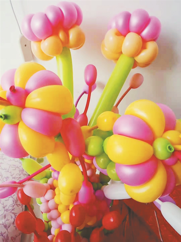 制作气球造型,不仅拧起来费劲,还要考虑每个气球的充气情况。像小红花这种简单的气球造型,一般几分钟就能做完,而样式复杂、体量大的,如婚庆用的大型拱门往往需要三四天。