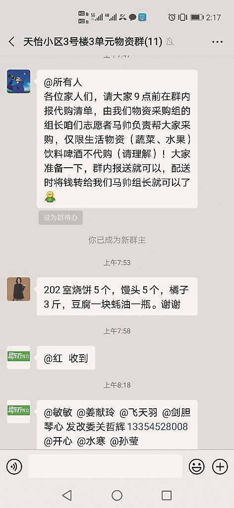 1月20日上午,在小区封闭单元的居民群内,在政府采购物资发放前,居民们的日常生活物资在物资保障服务组志愿者们的帮助下全部采购完毕并送到家中。居民只需在群里用红包付款即可,既安全又方便。